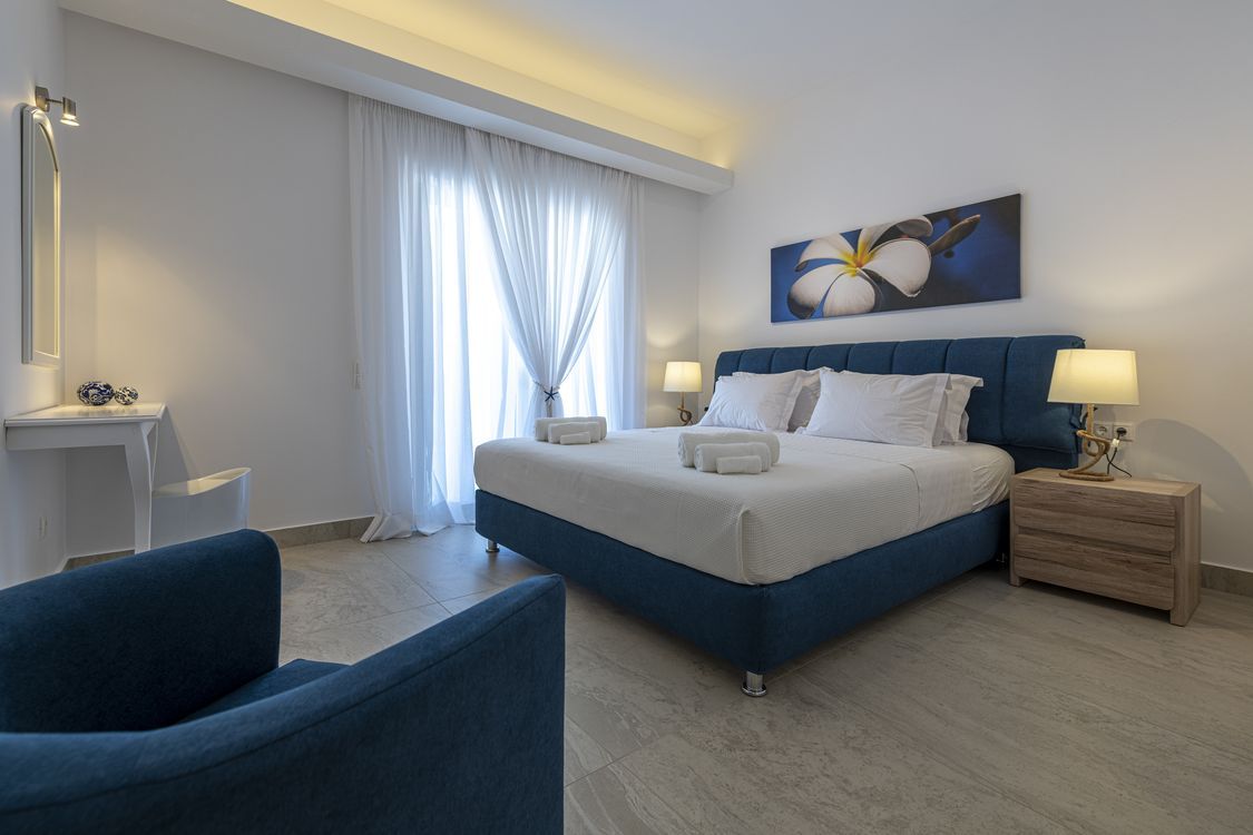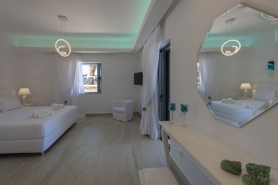 Две спальни с двуспальными кроватями — с ванными комнатами и индивидуальными патио.