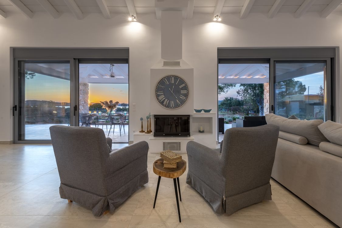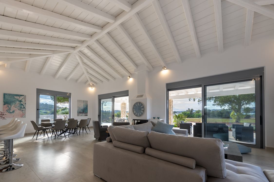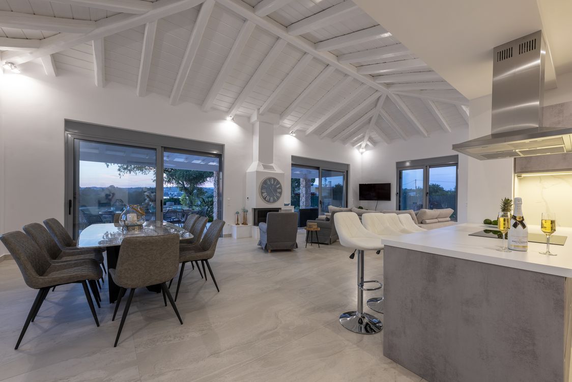 Центральное пространство объединяет стильную гостиную с камином, обеденную зону и кухню открытой планировки с панорамными окнами. Каждая зона — с видом на бассейн, море и пышный сад.