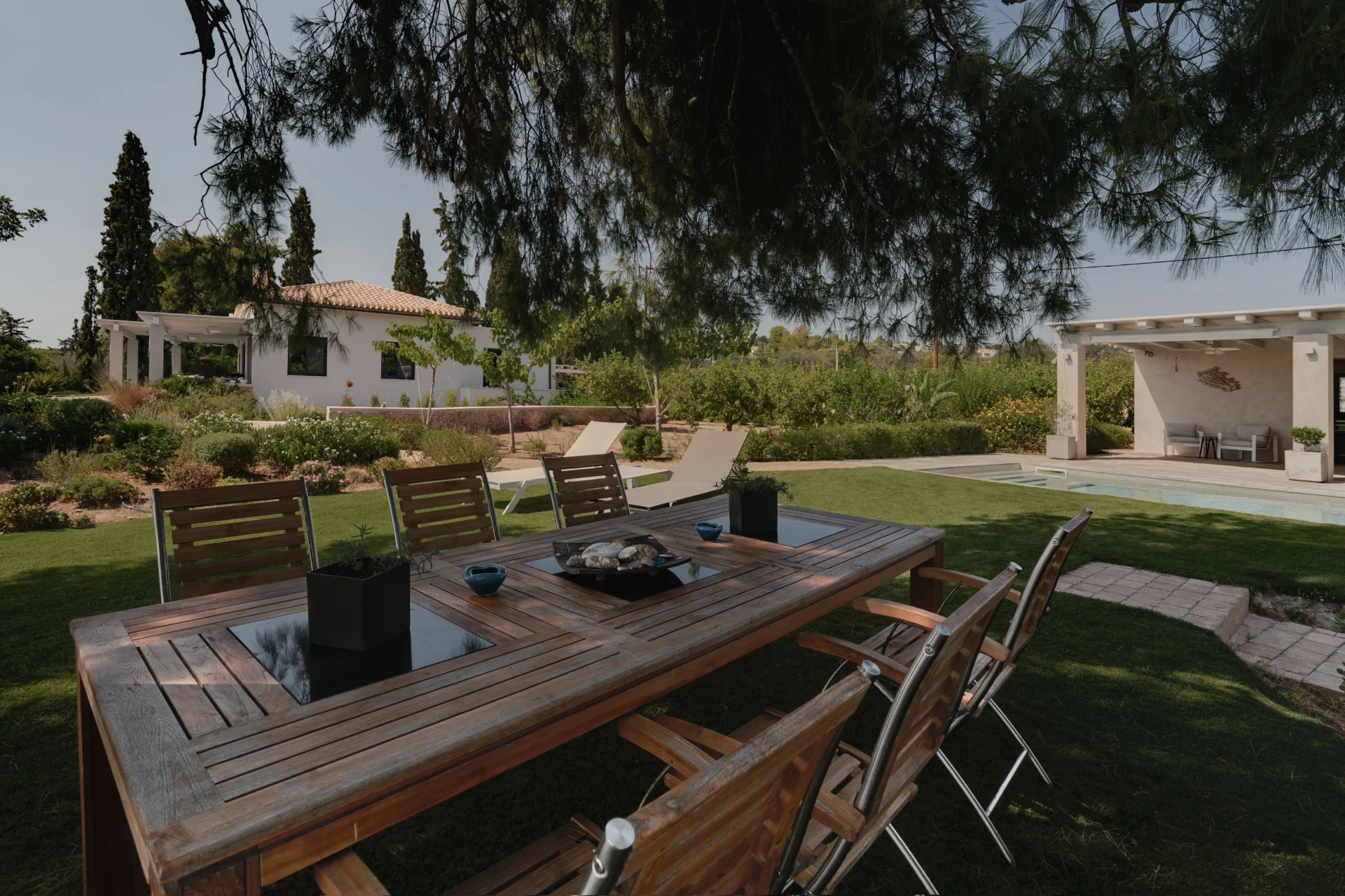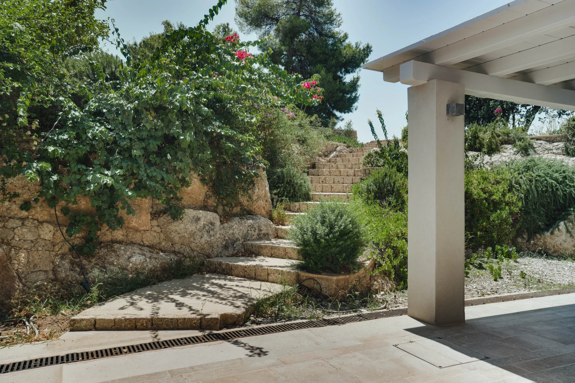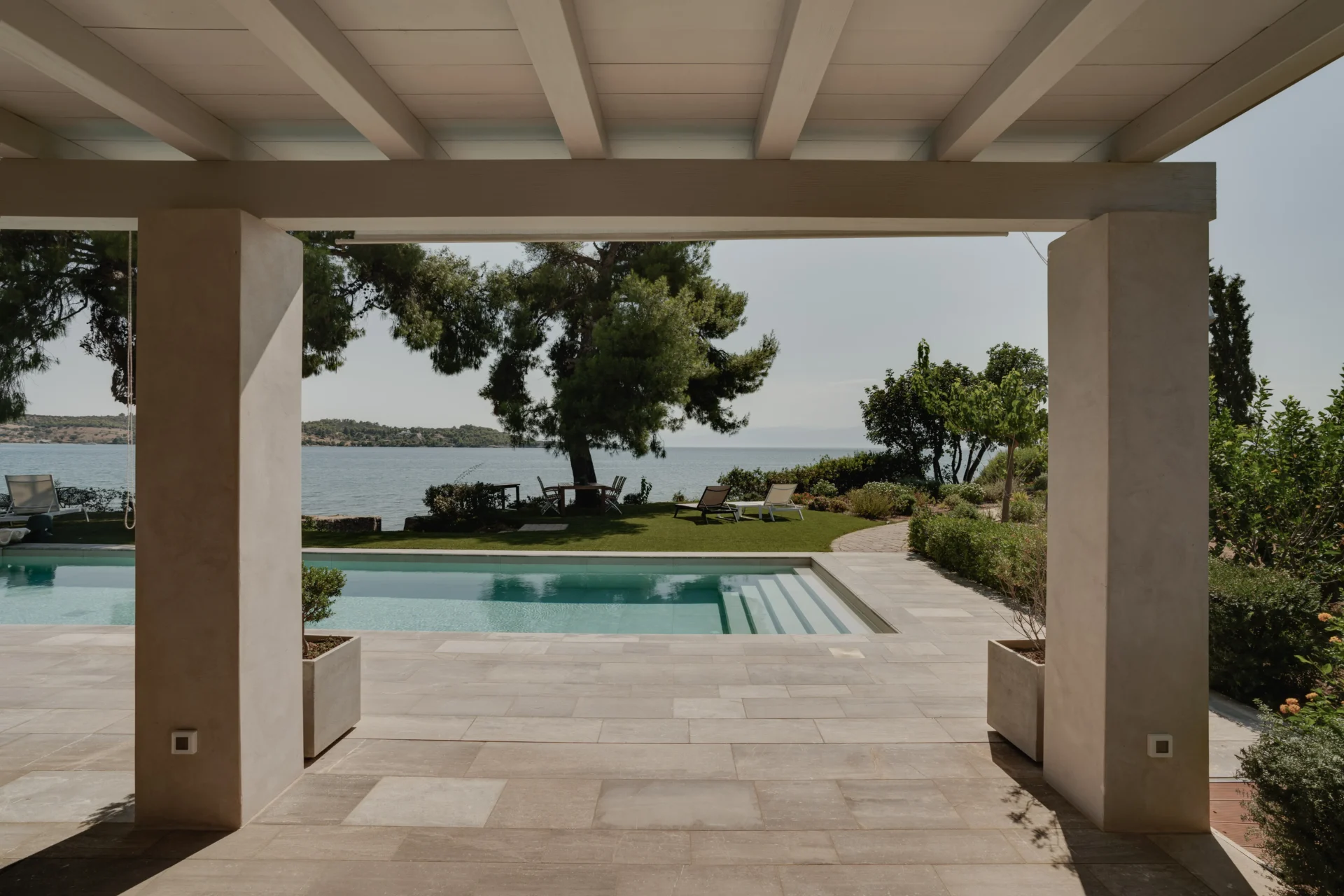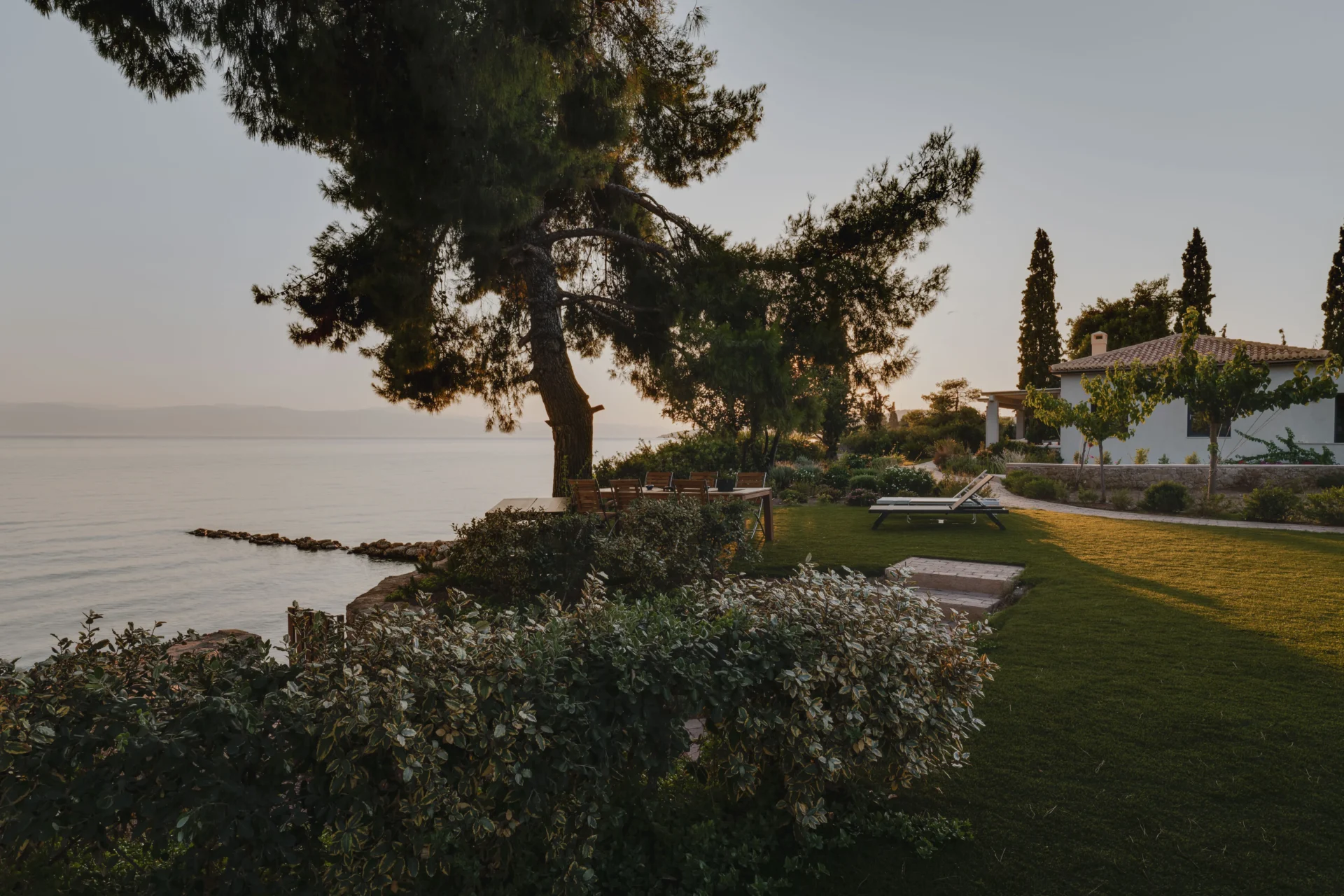 Расположенная на благоустроенном участке площадью 2 500 м², вилла утопает в зелени пышного сада с лимонными деревьями. Участок граничит с морем и включает два частных пляжа, а также собственную морскую террасу — идеальное место для швартовки тендера, катера или небольшой яхты.