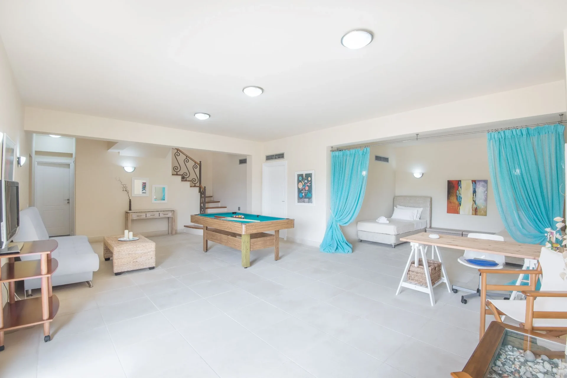 На вилле — бассейн 55 м² с панорамным видом на море, окруженный солнечной террасой, лаунж-зоной и перголой. Атмосферный бар у бассейна, удобные шезлонги, мягкие диваны и обеденная зона на 10 персон позволяют наслаждаться блюдами на свежем воздухе, наблюдая закат или слушая шум прибоя.
