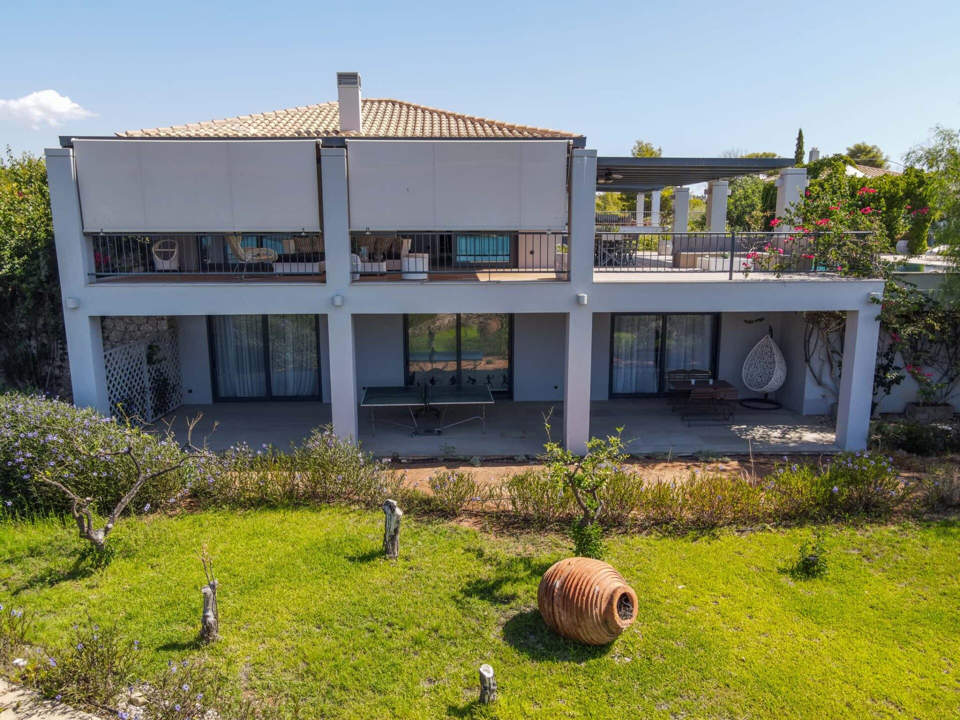 Просторная вилла в Порто Хели на двух уровнях общей площадью 318 м² располагается на участке 1 613 м², выходящем прямо к берегу. На верхнем уровне пространство организовано так, чтобы обеспечивать плавный переход от одной зоны к другой: светлая кухня открытого плана, гостиная с видом на сад, мини-кабинет и выход на веранду с бассейном и баром, утопающим в зелени.