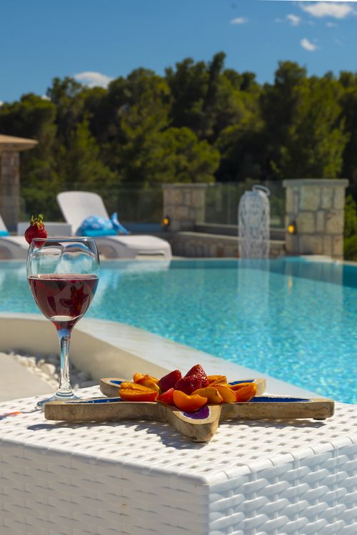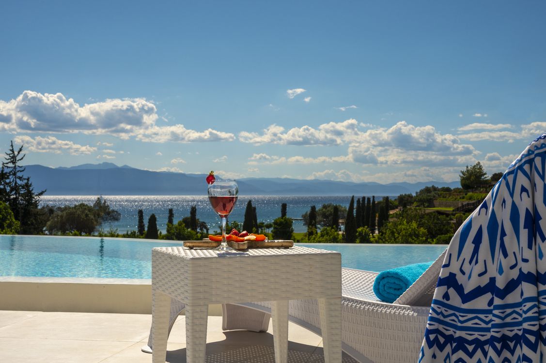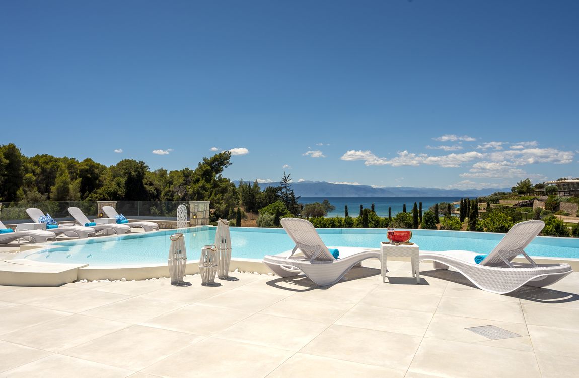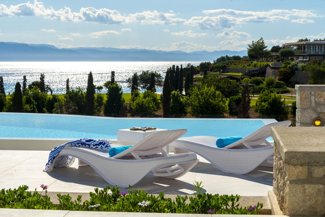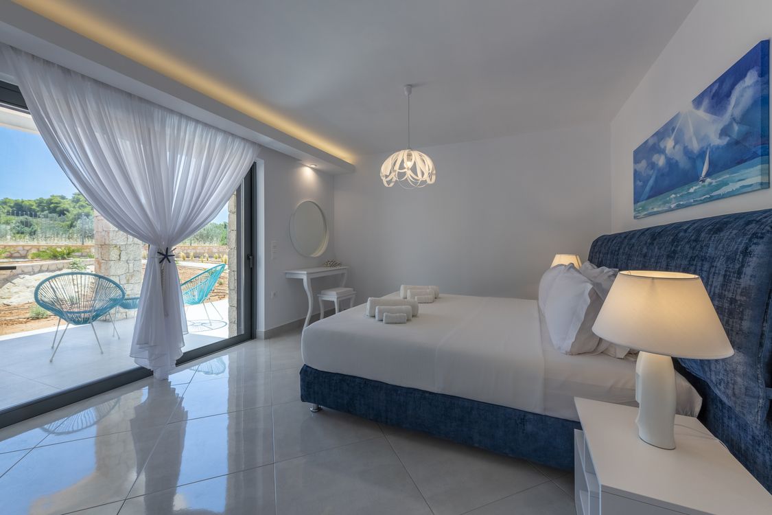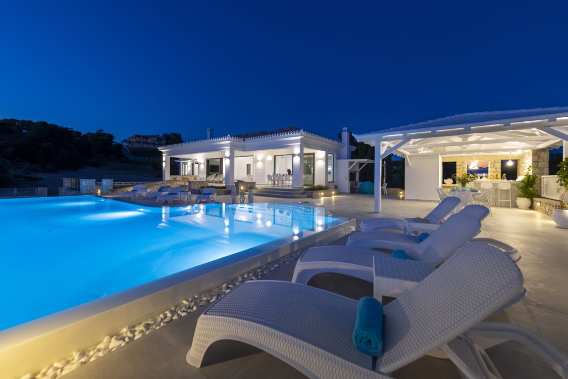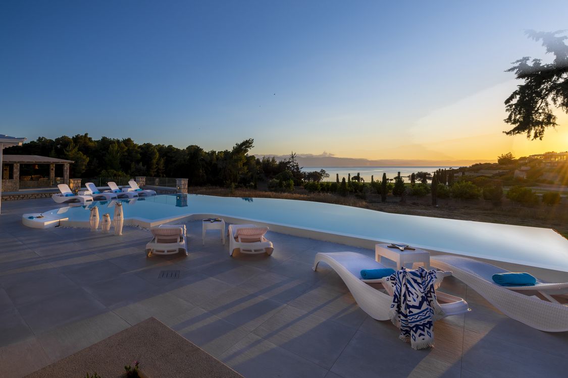 Surrounded by an expansive garden with olive trees and natural stone, the villa features terraces, lounge areas, a bar, two outdoor dining areas, and an infinity pool that seamlessly blends into the horizon.
