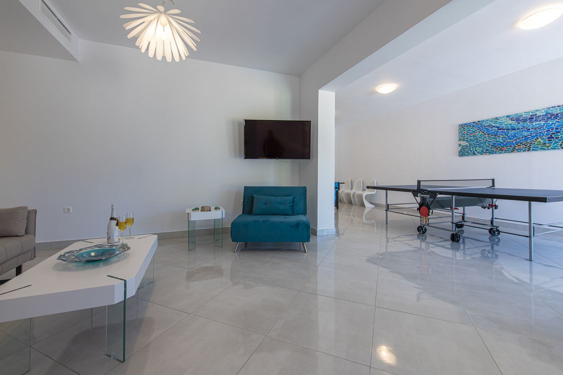 - Lower level: four en-suite bedrooms, one twin bedroom, a lounge area with two sofa beds, and a games area.