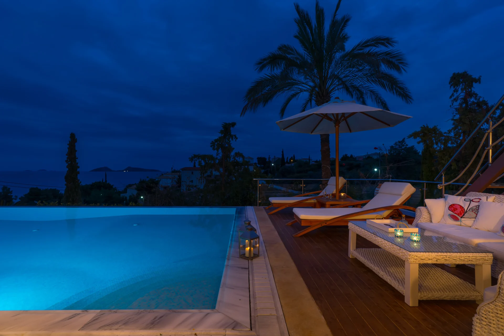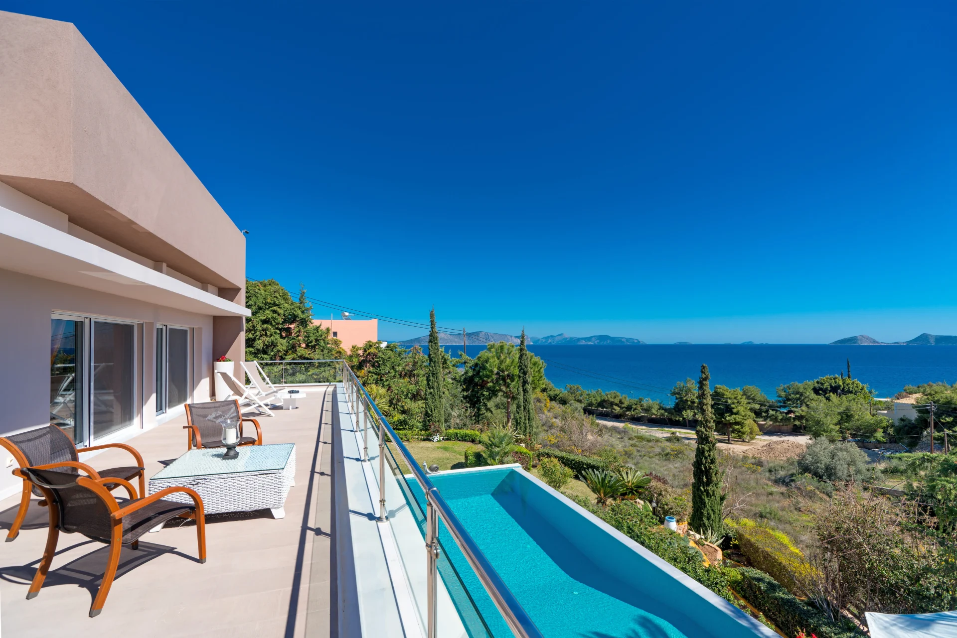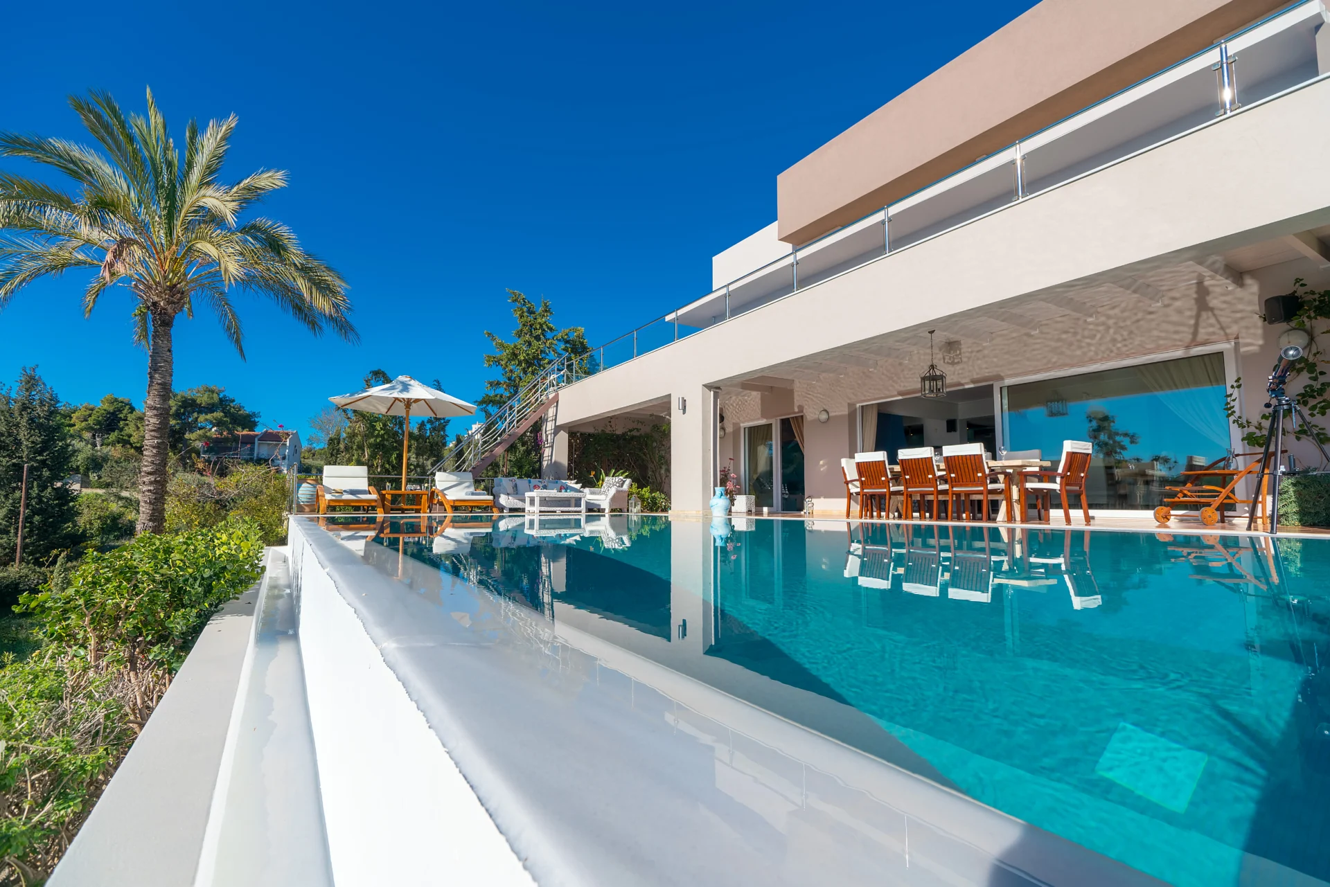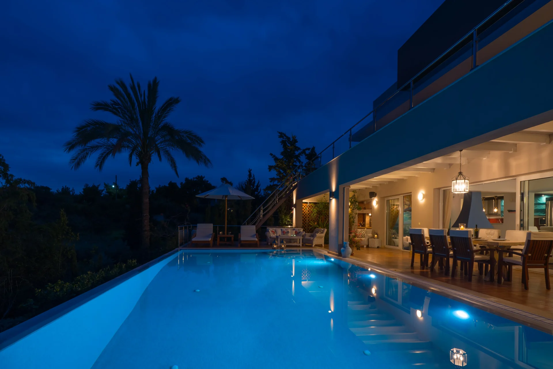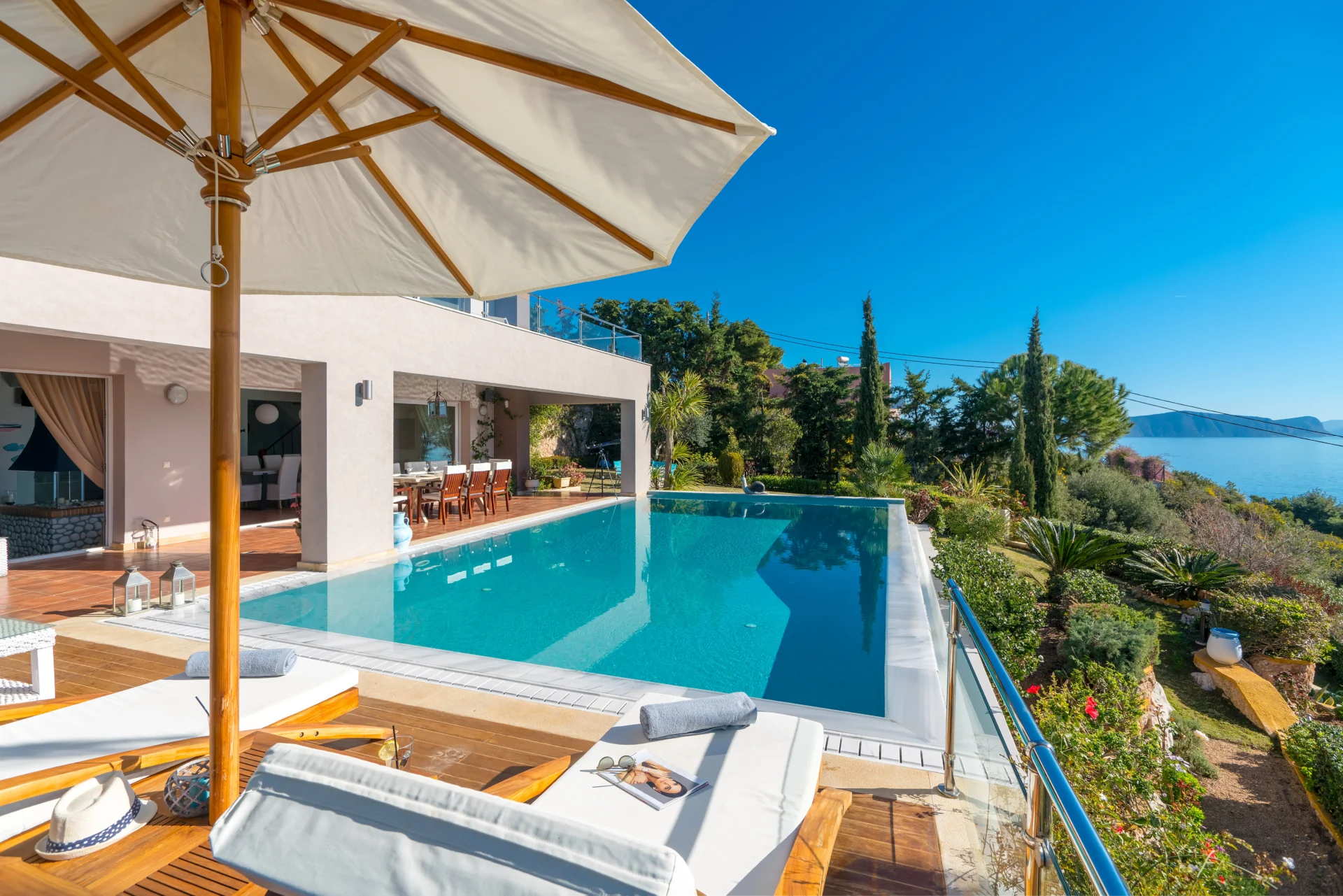 The landscaped infinity pool with sea views, secluded garden corners, the scent of citrus trees, vineyards, and palms — all create a sense of a true Greek retreat. In the evening, the villa becomes an ideal setting for dinner, a glass of wine, and stargazing.