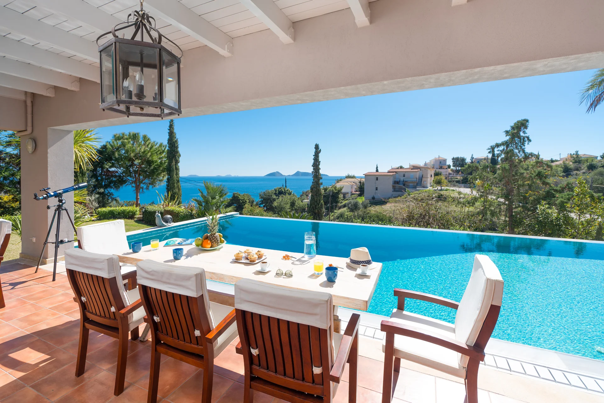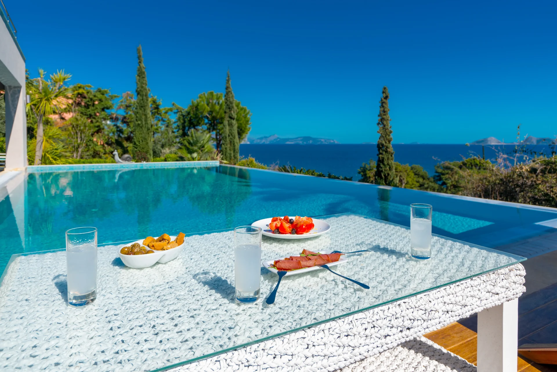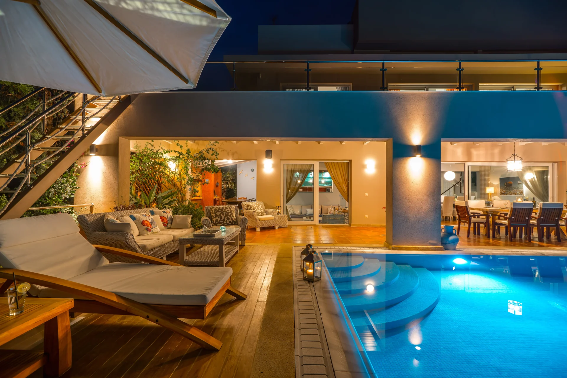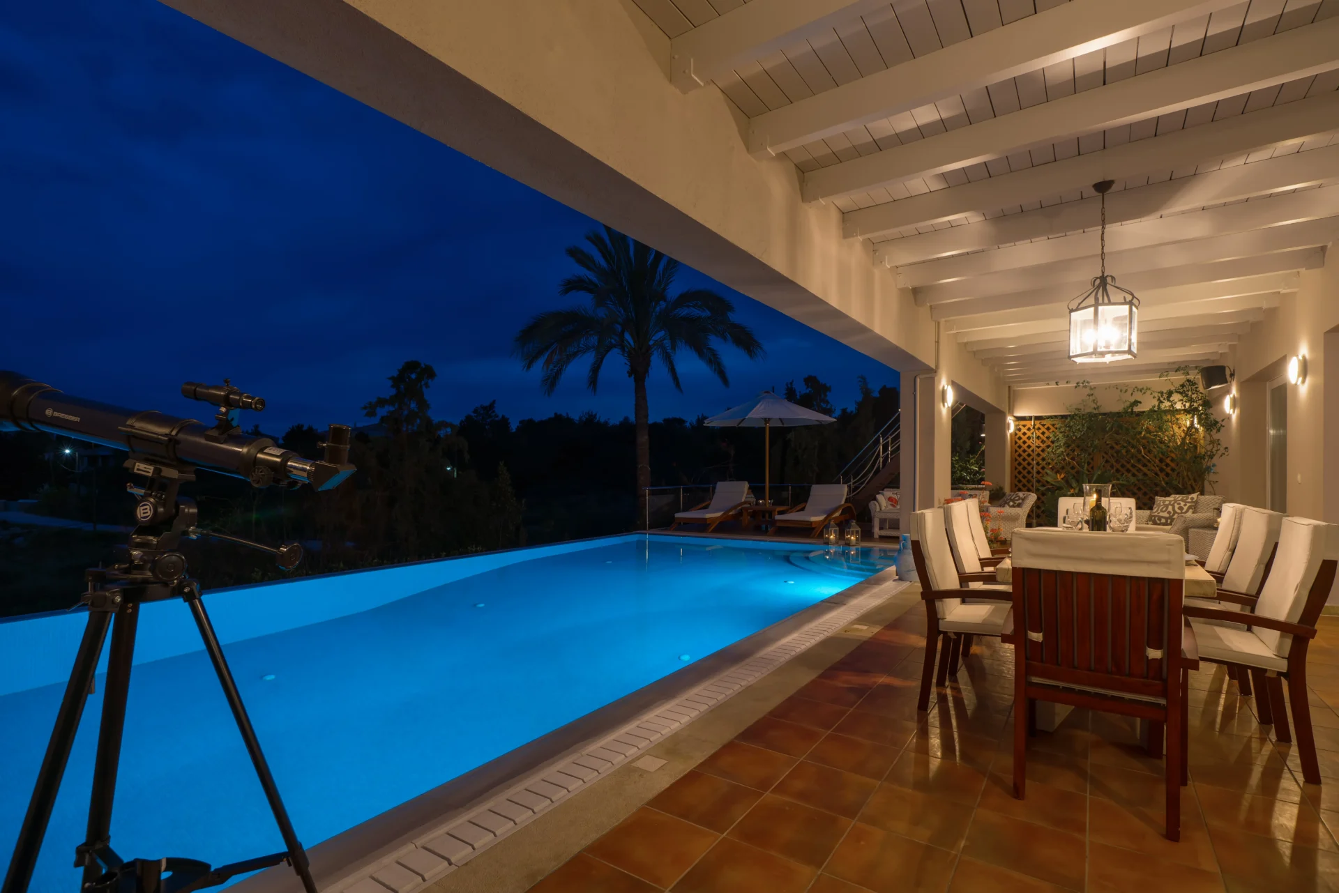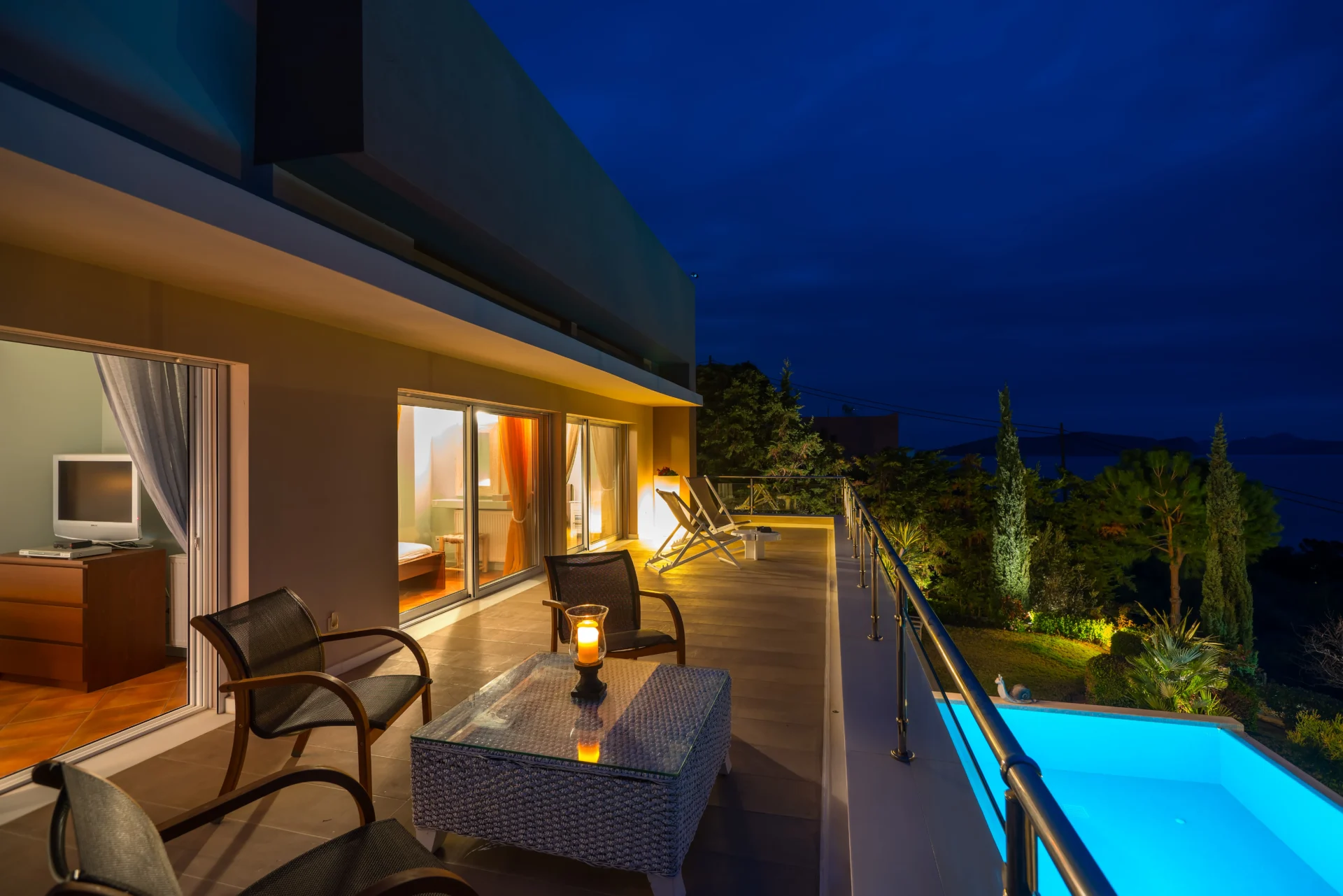 The landscaped infinity pool with sea views, secluded garden corners, the scent of citrus trees, vineyards, and palms — all create a sense of a true Greek retreat. In the evening, the villa becomes an ideal setting for dinner, a glass of wine, and stargazing.