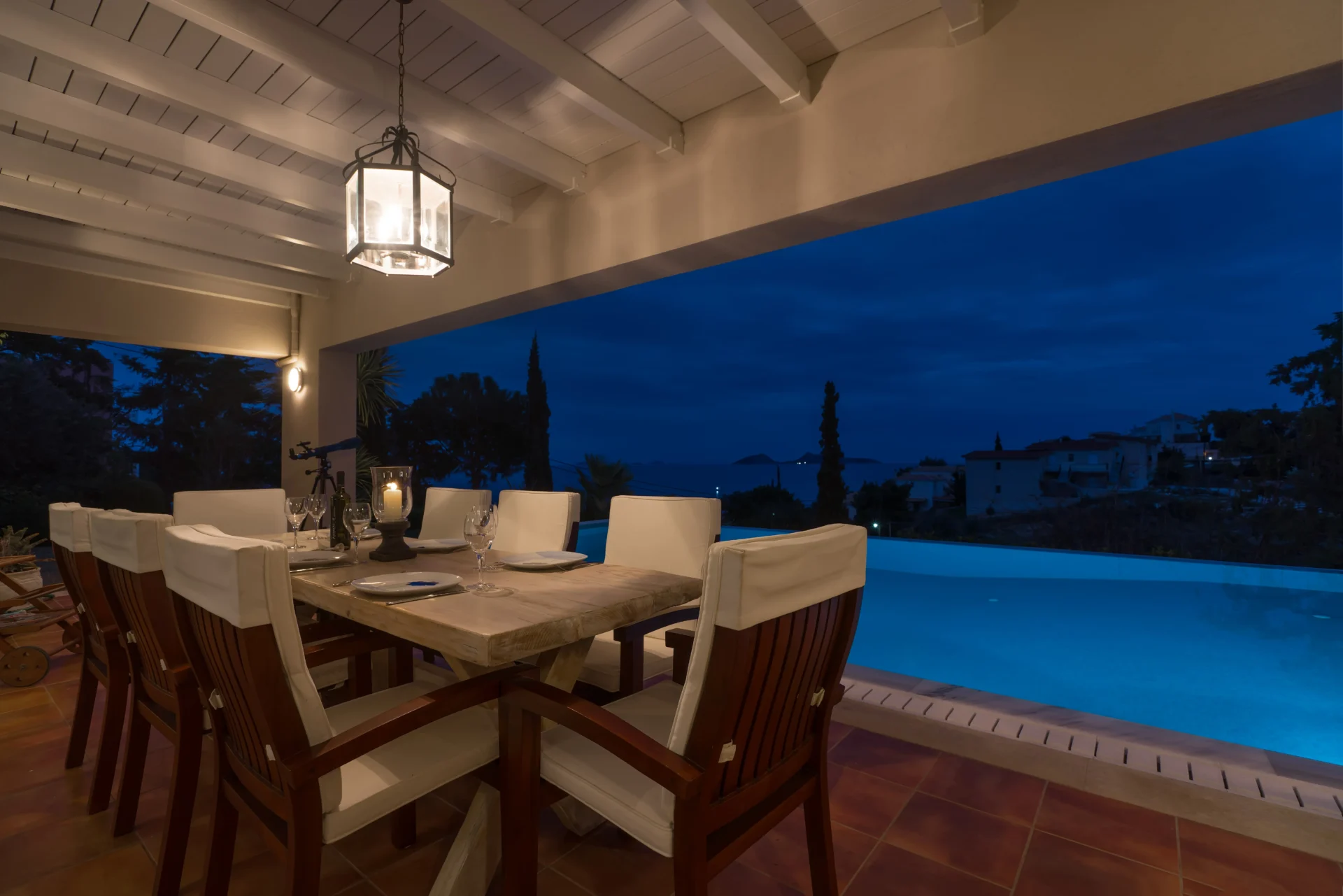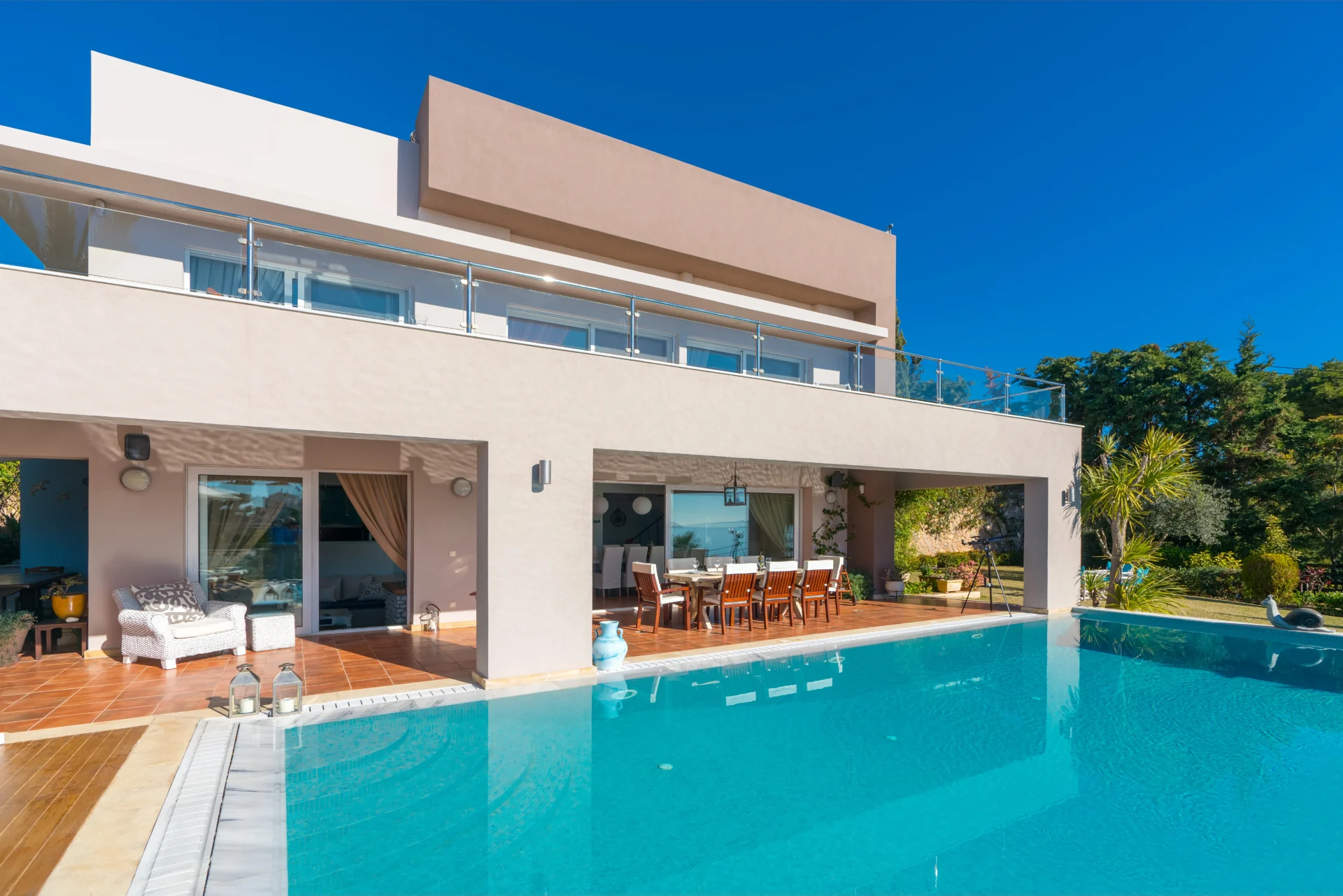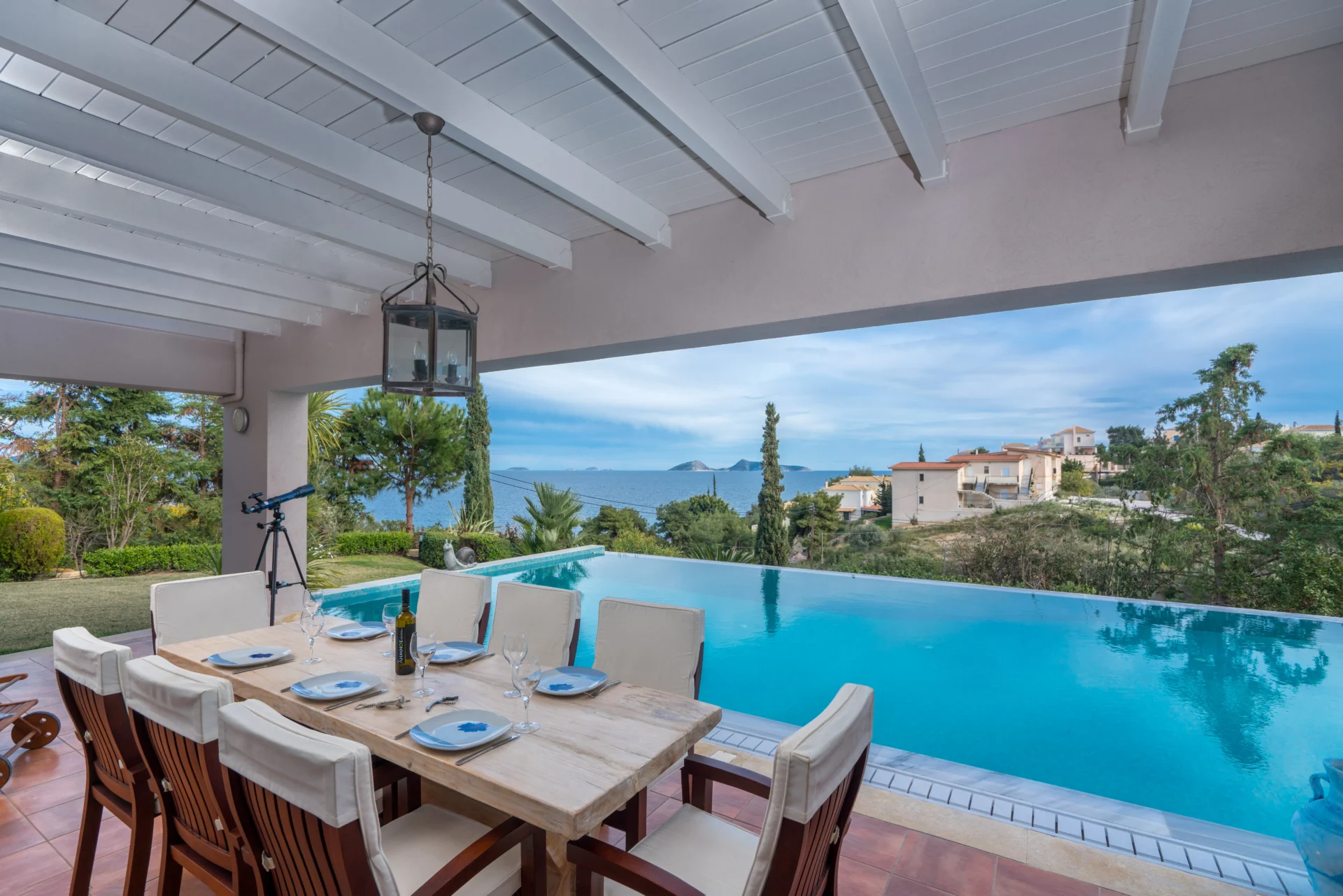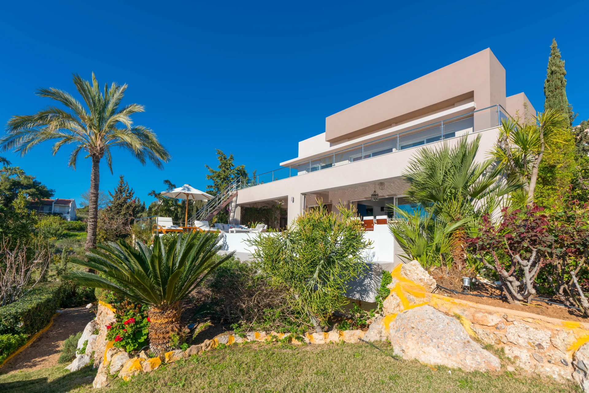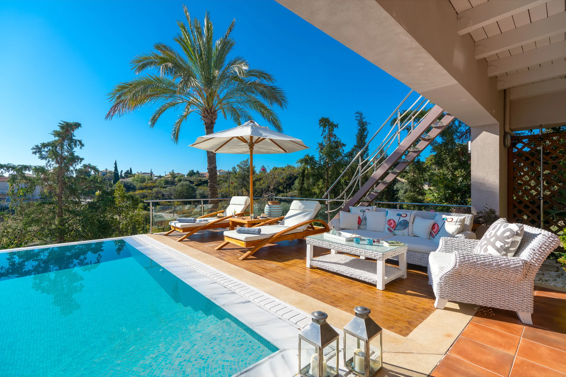 The landscaped infinity pool with sea views, secluded garden corners, the scent of citrus trees, vineyards, and palms — all create a sense of a true Greek retreat. In the evening, the villa becomes an ideal setting for dinner, a glass of wine, and stargazing.