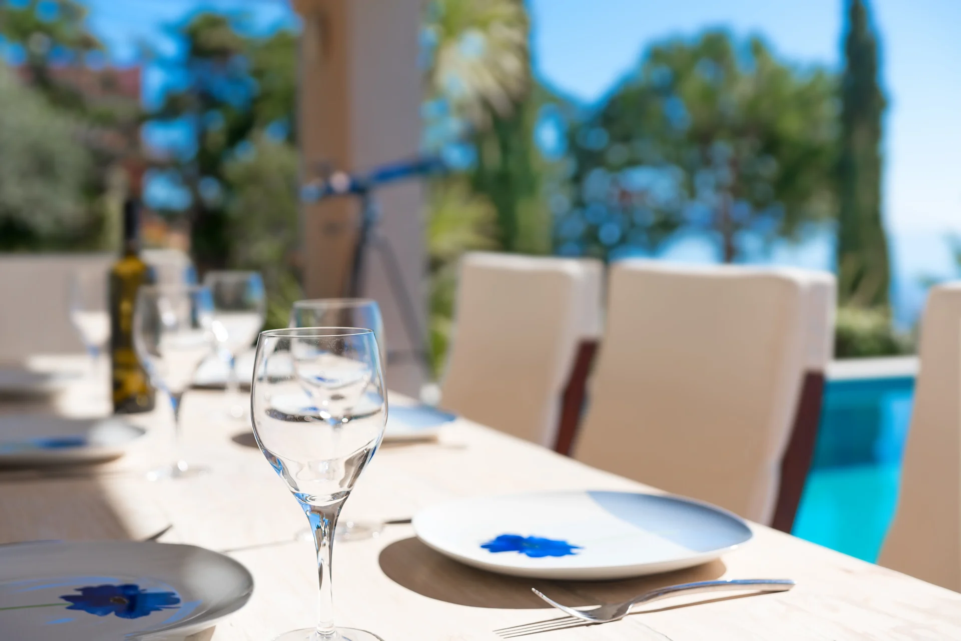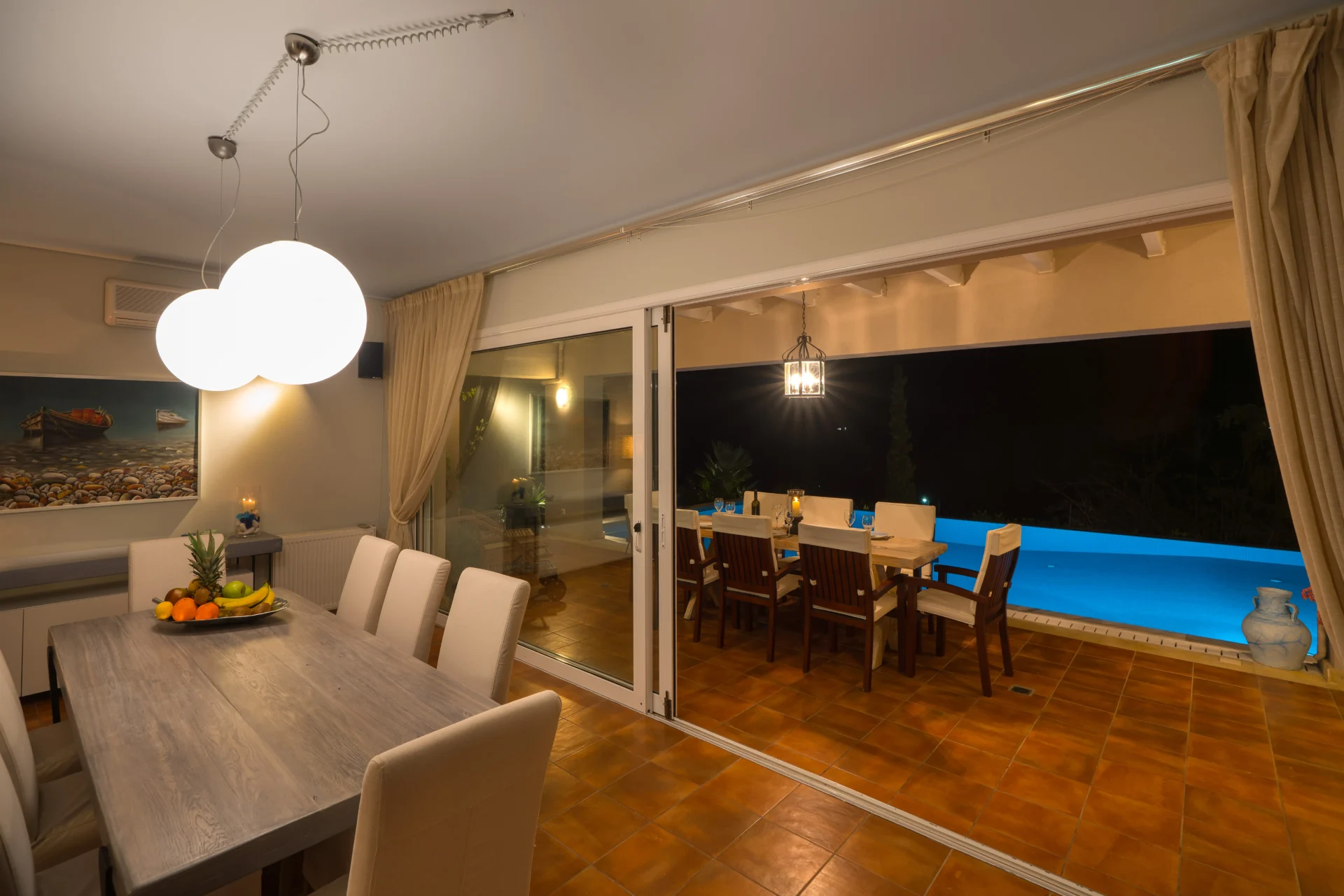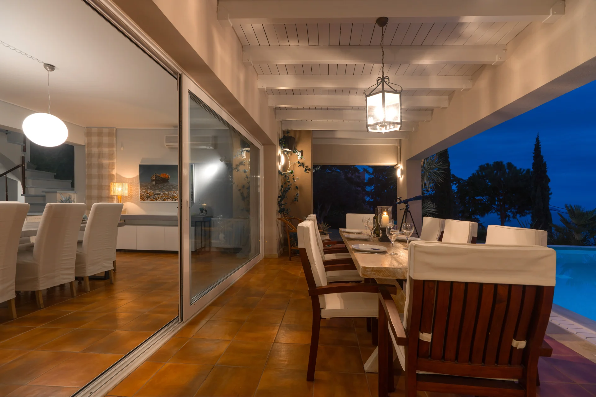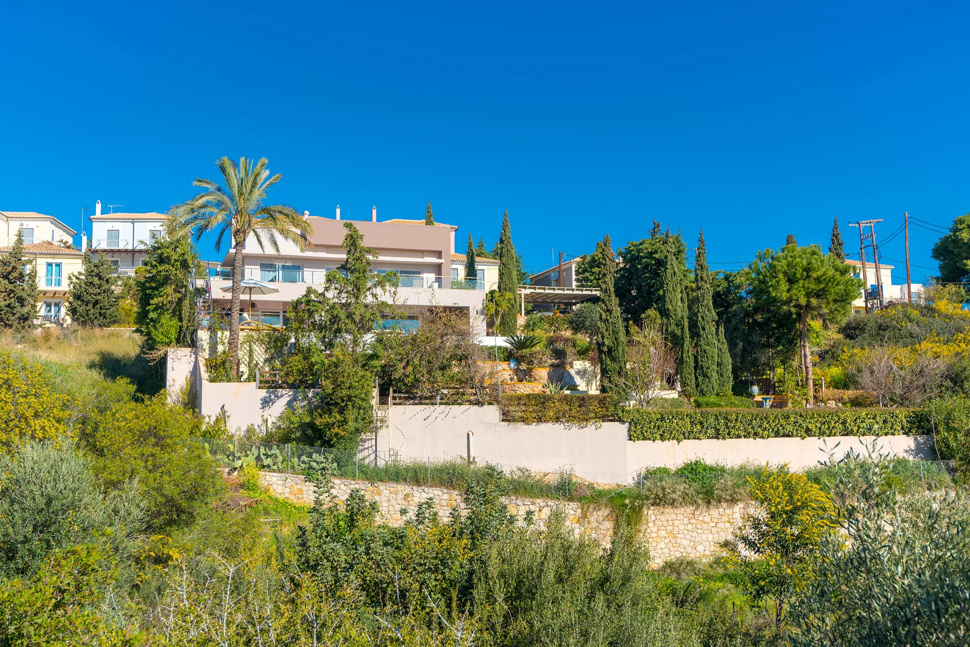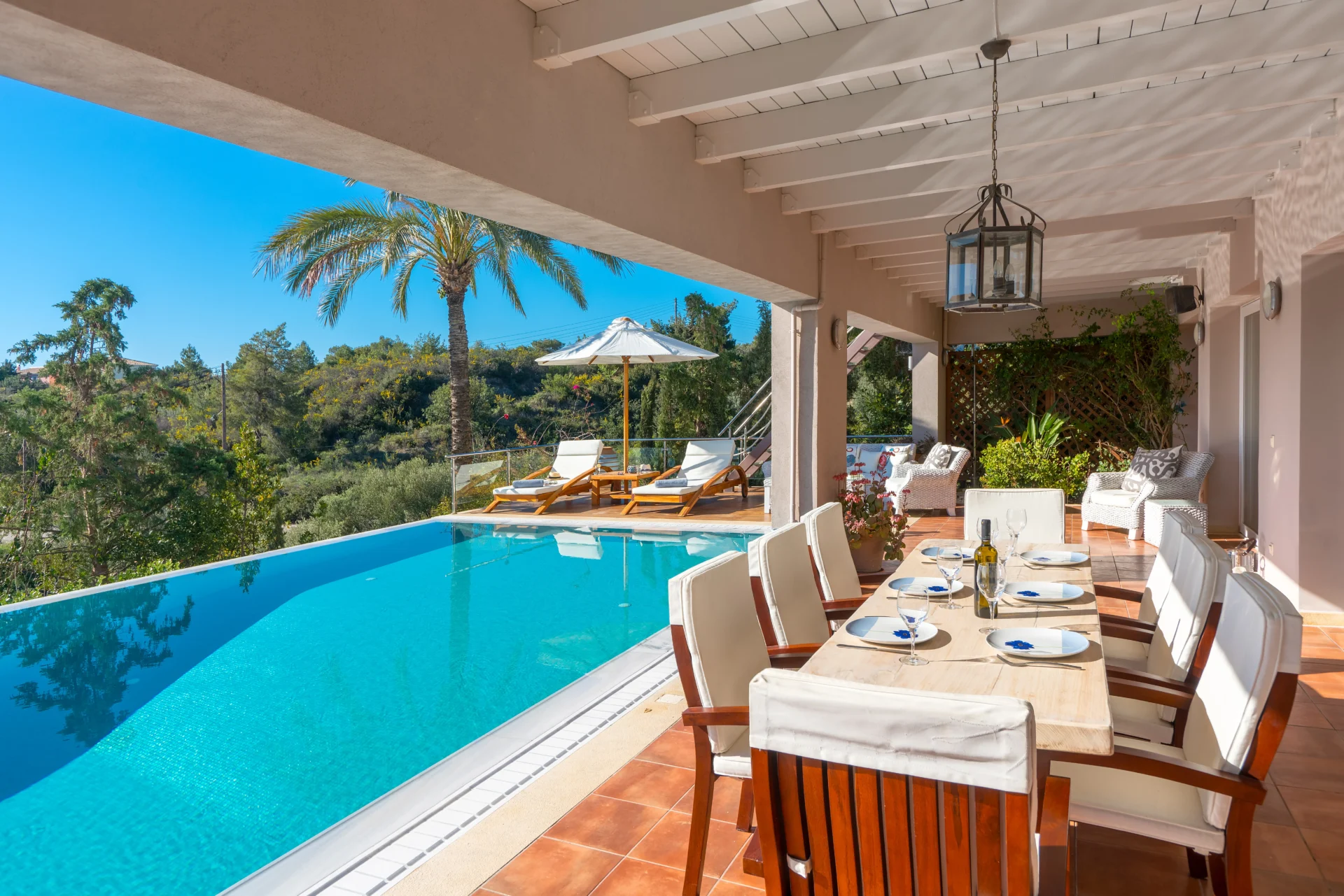 The landscaped infinity pool with sea views, secluded garden corners, the scent of citrus trees, vineyards, and palms — all create a sense of a true Greek retreat. In the evening, the villa becomes an ideal setting for dinner, a glass of wine, and stargazing.
