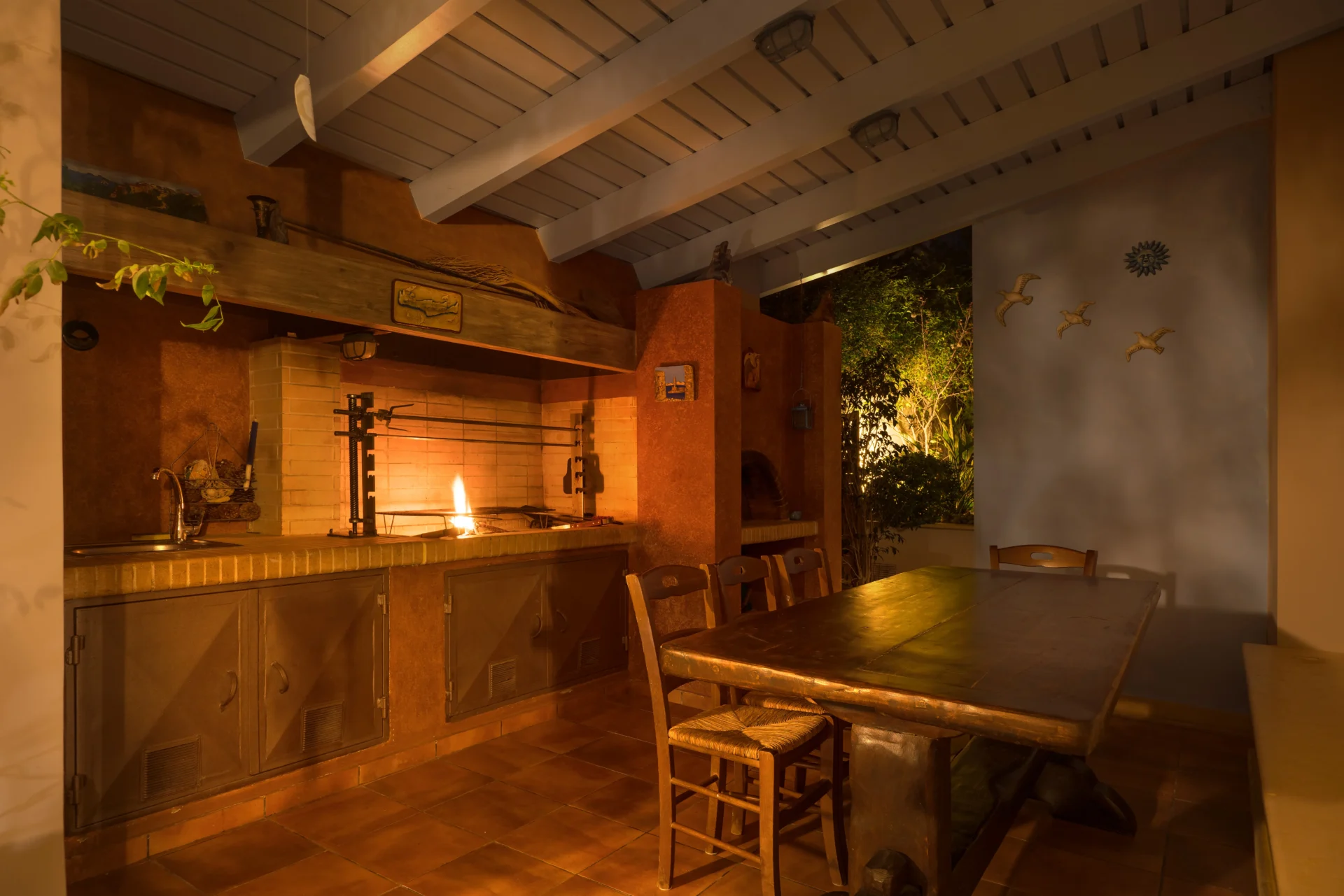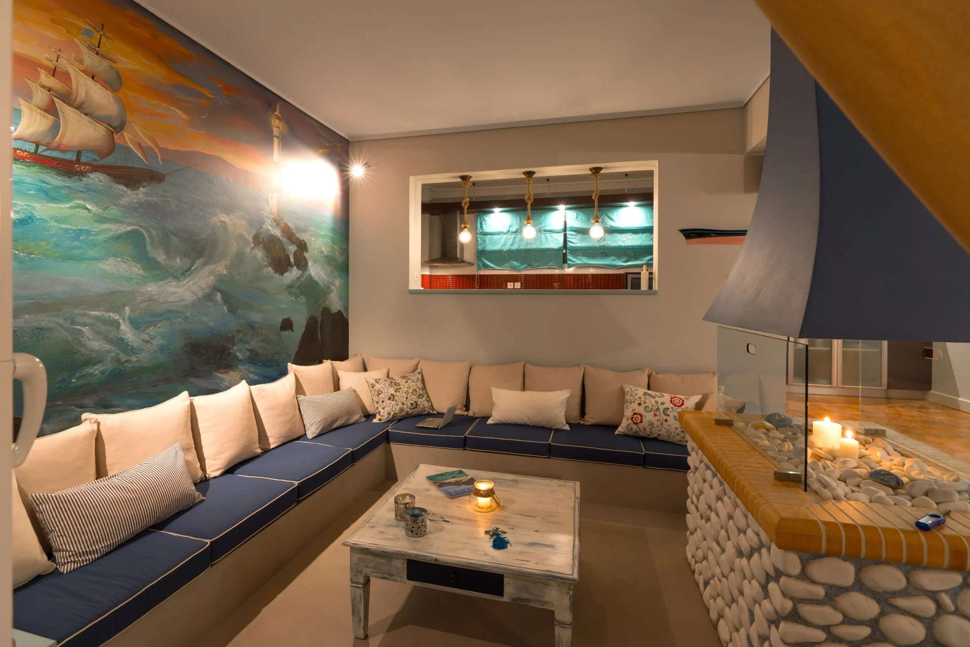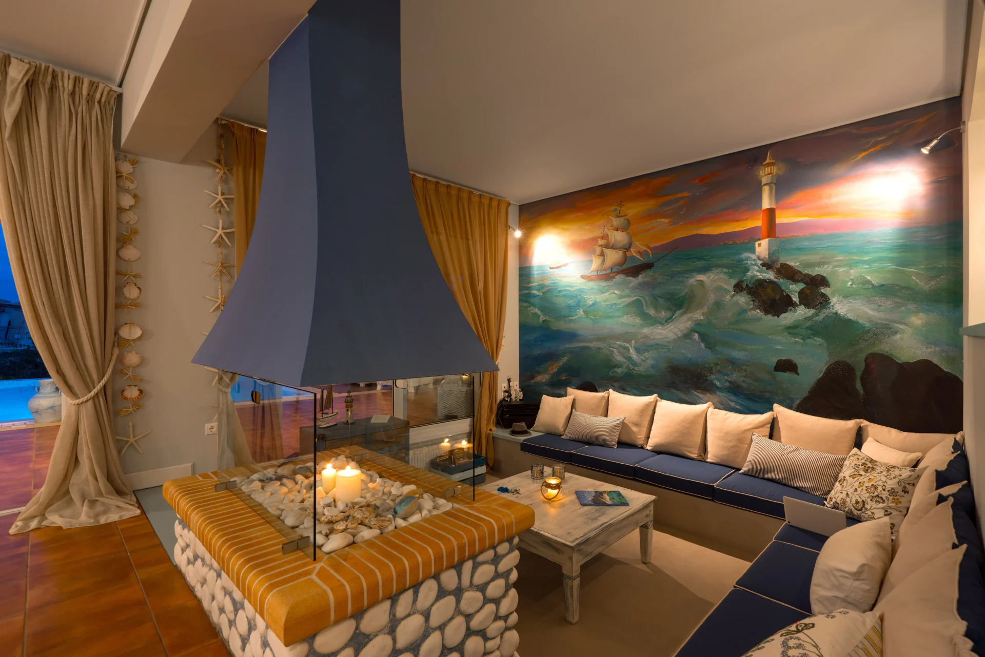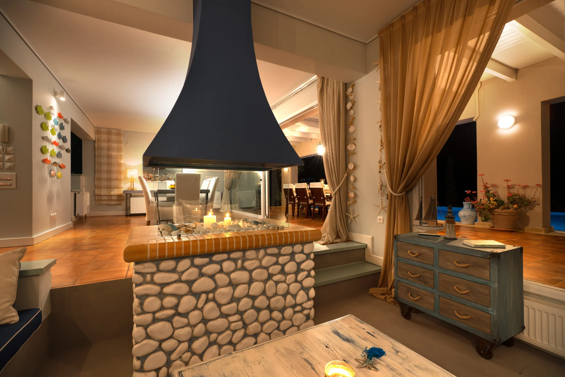 On the main level, there is an open-plan kitchen, dining area, and living room with a fireplace. From here, you step onto a wide covered terrace overlooking the infinity pool and the sea. Every detail invites you to slow down — from the artistic interior touches to the sunrises enjoyed with a morning coffee.