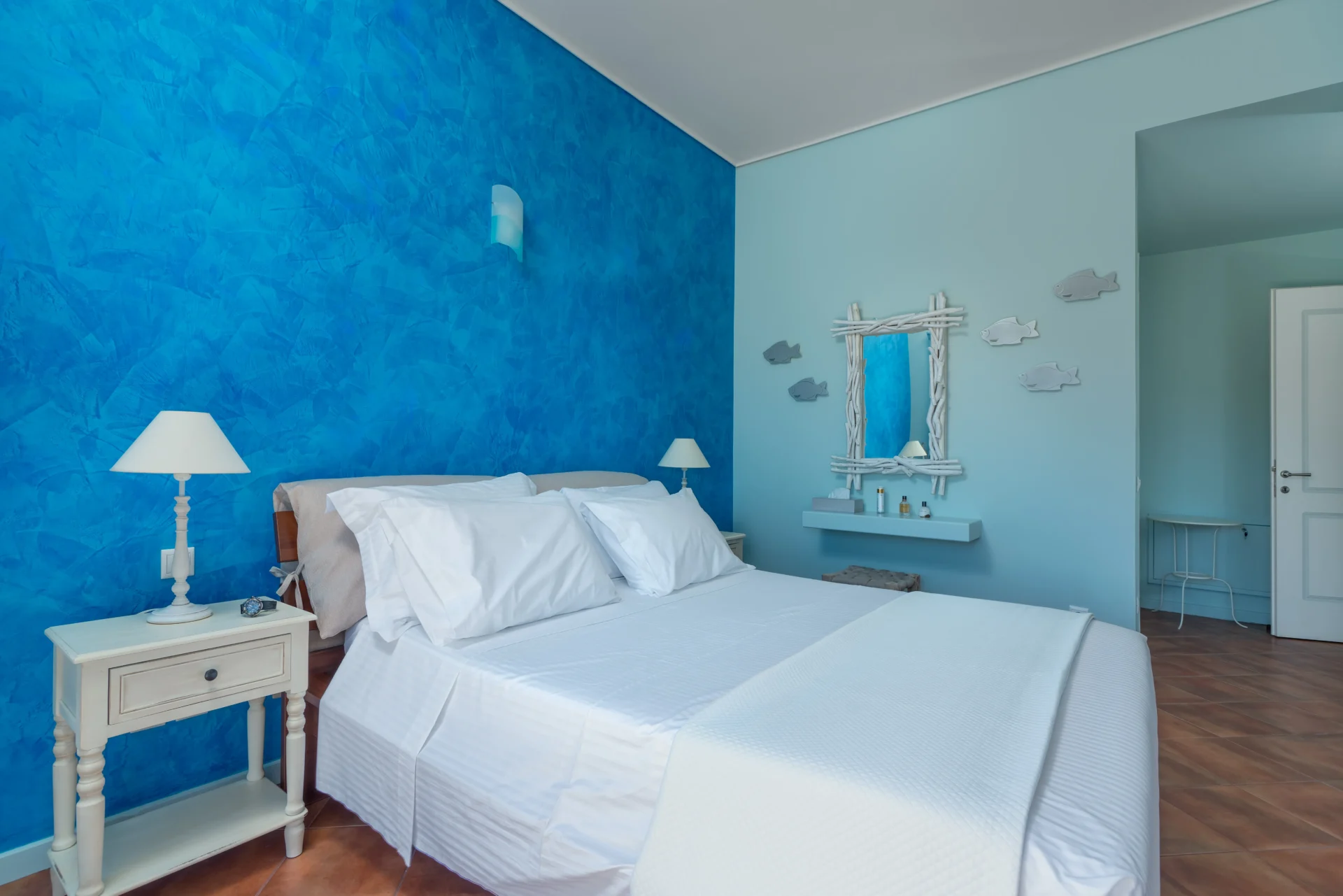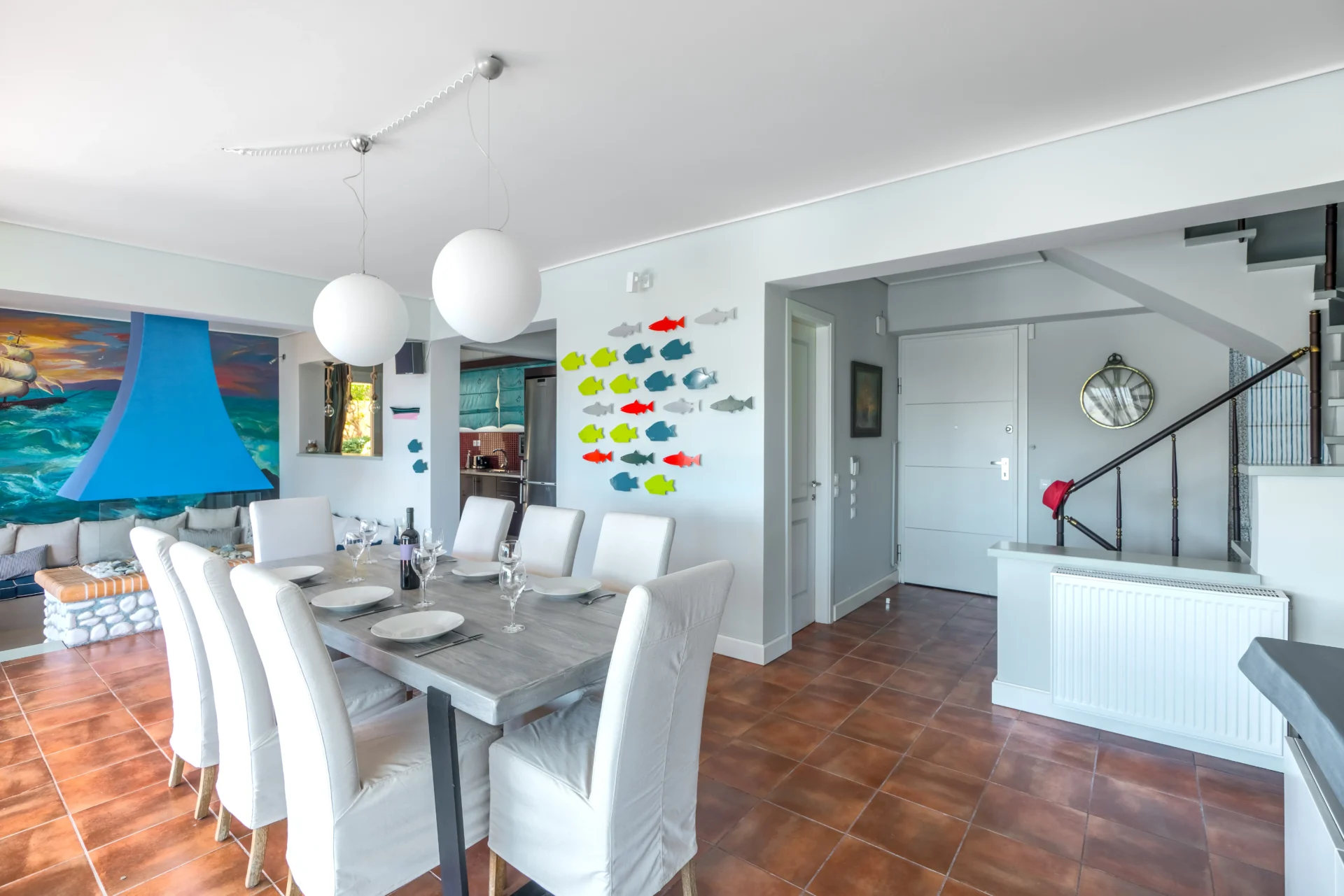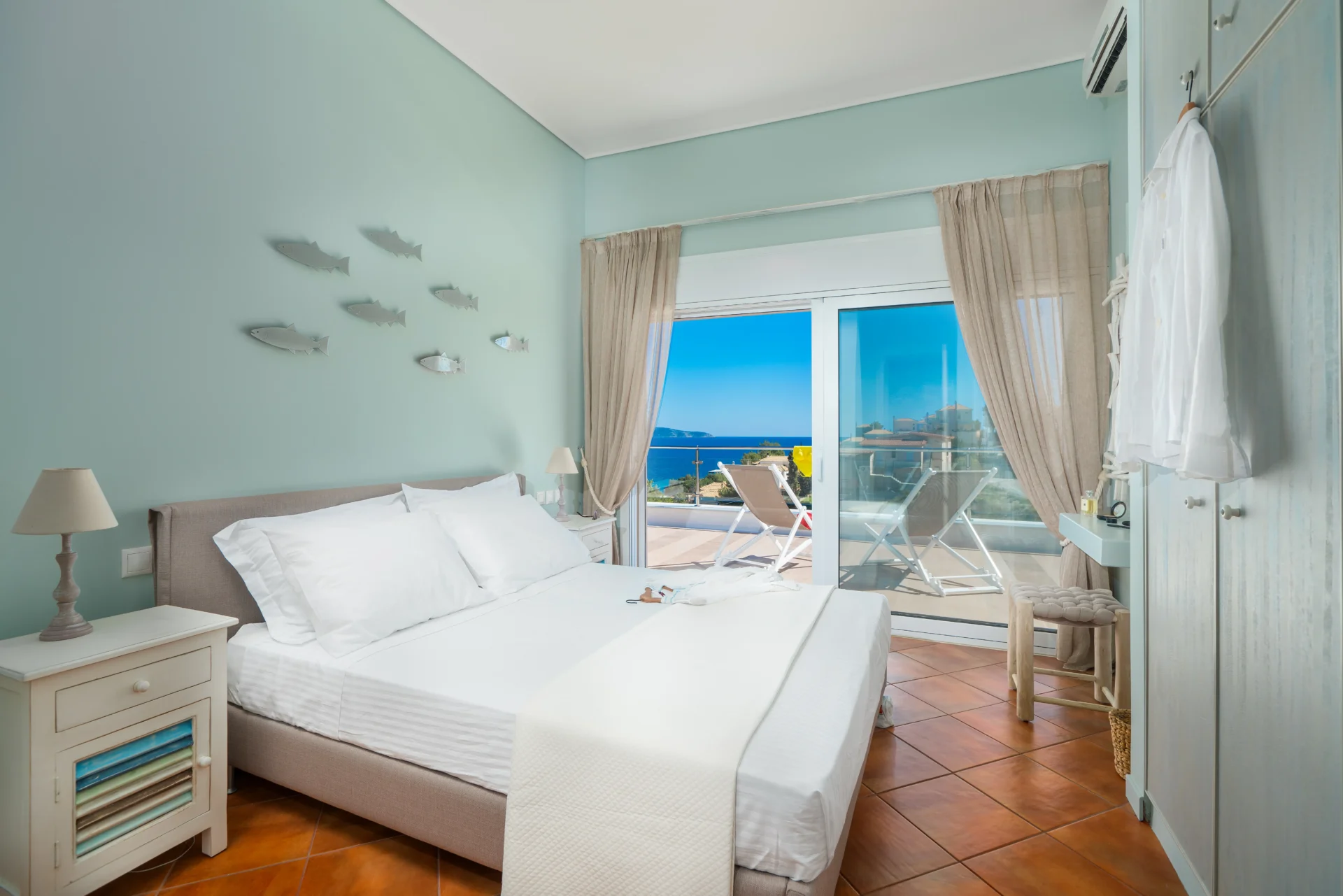 On the main level, there is an open-plan kitchen, dining area, and living room with a fireplace. From here, you step onto a wide covered terrace overlooking the infinity pool and the sea. Every detail invites you to slow down — from the artistic interior touches to the sunrises enjoyed with a morning coffee.