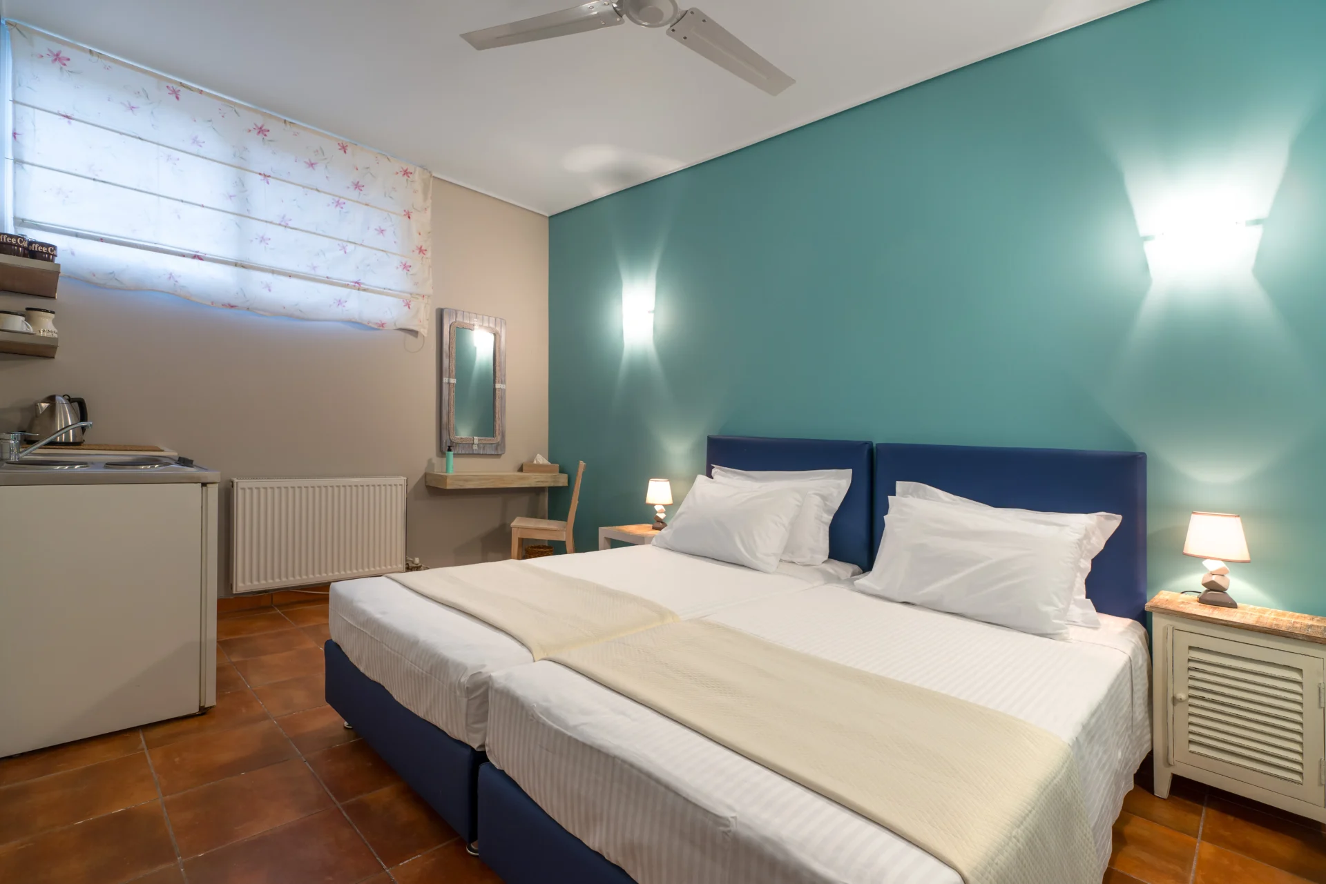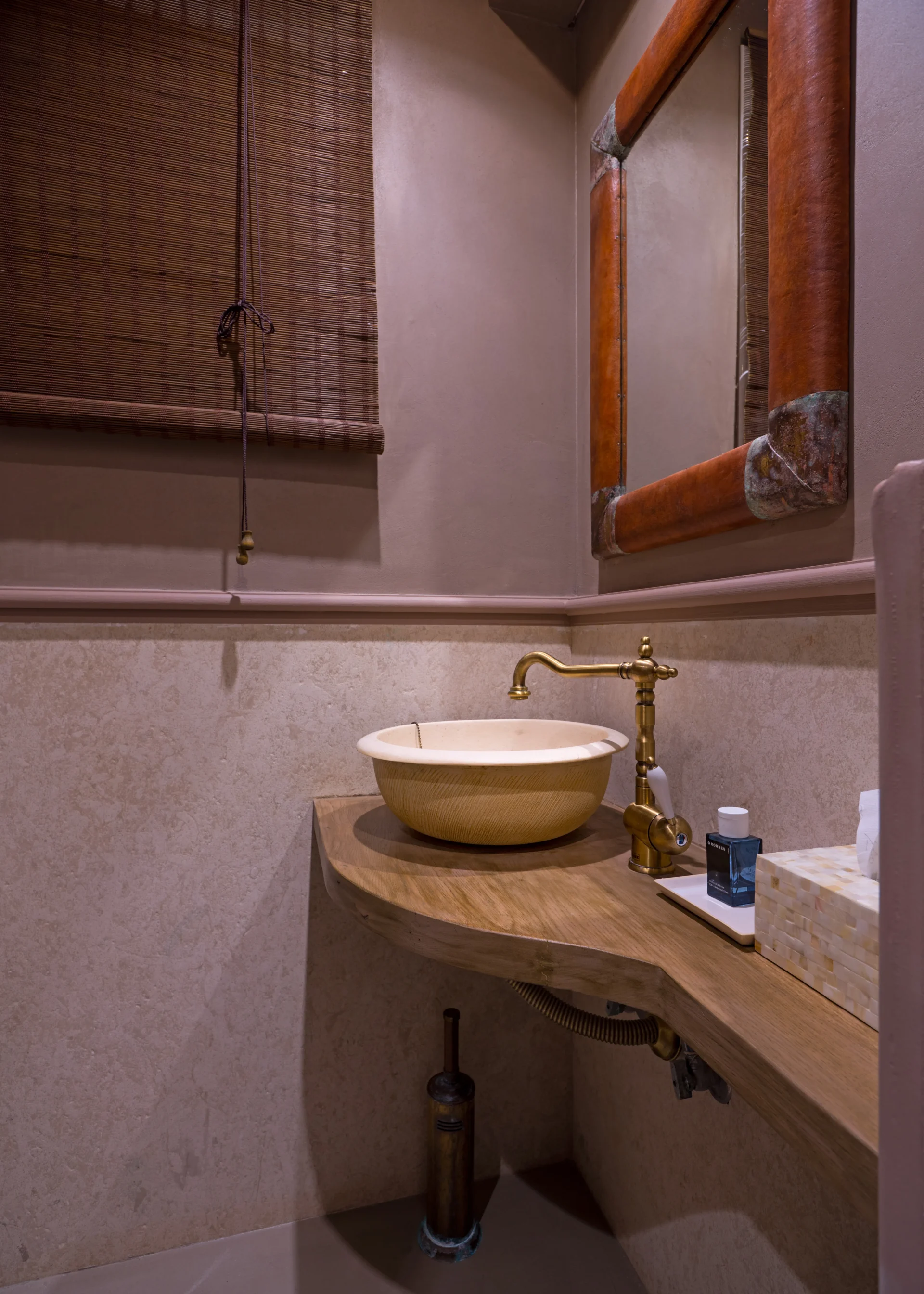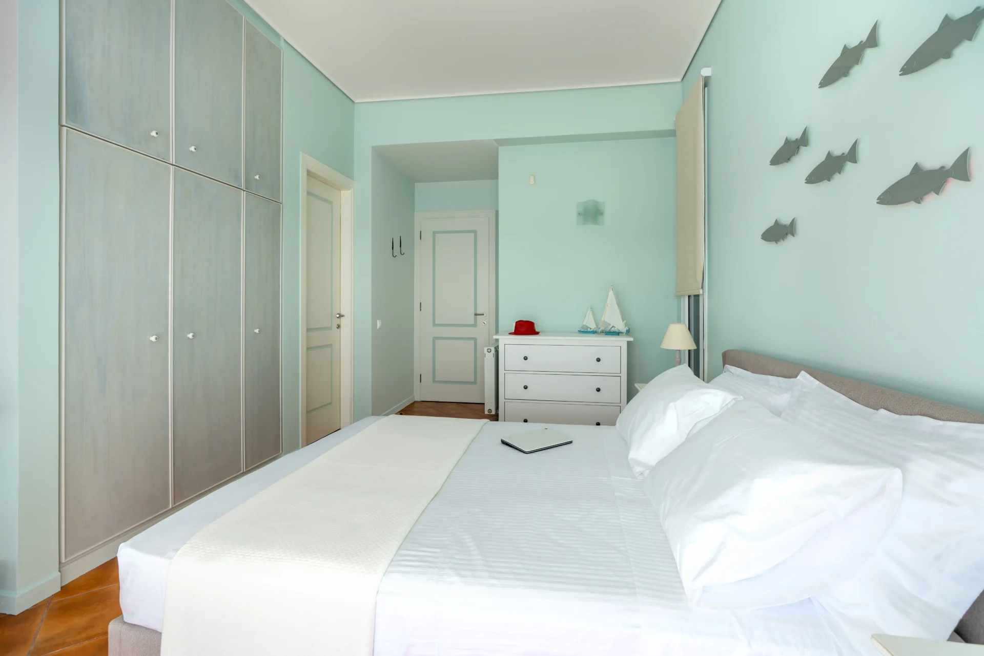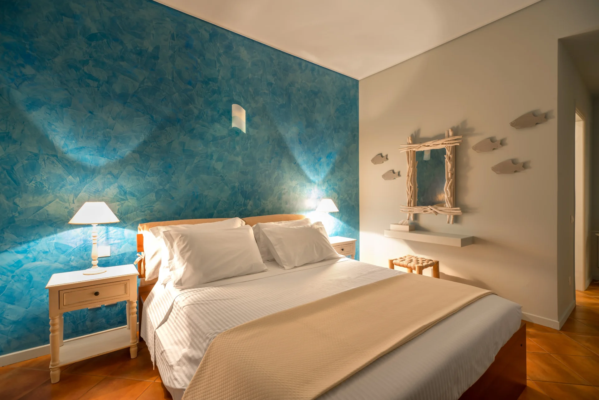 On the main level, there is an open-plan kitchen, dining area, and living room with a fireplace. From here, you step onto a wide covered terrace overlooking the infinity pool and the sea. Every detail invites you to slow down — from the artistic interior touches to the sunrises enjoyed with a morning coffee.