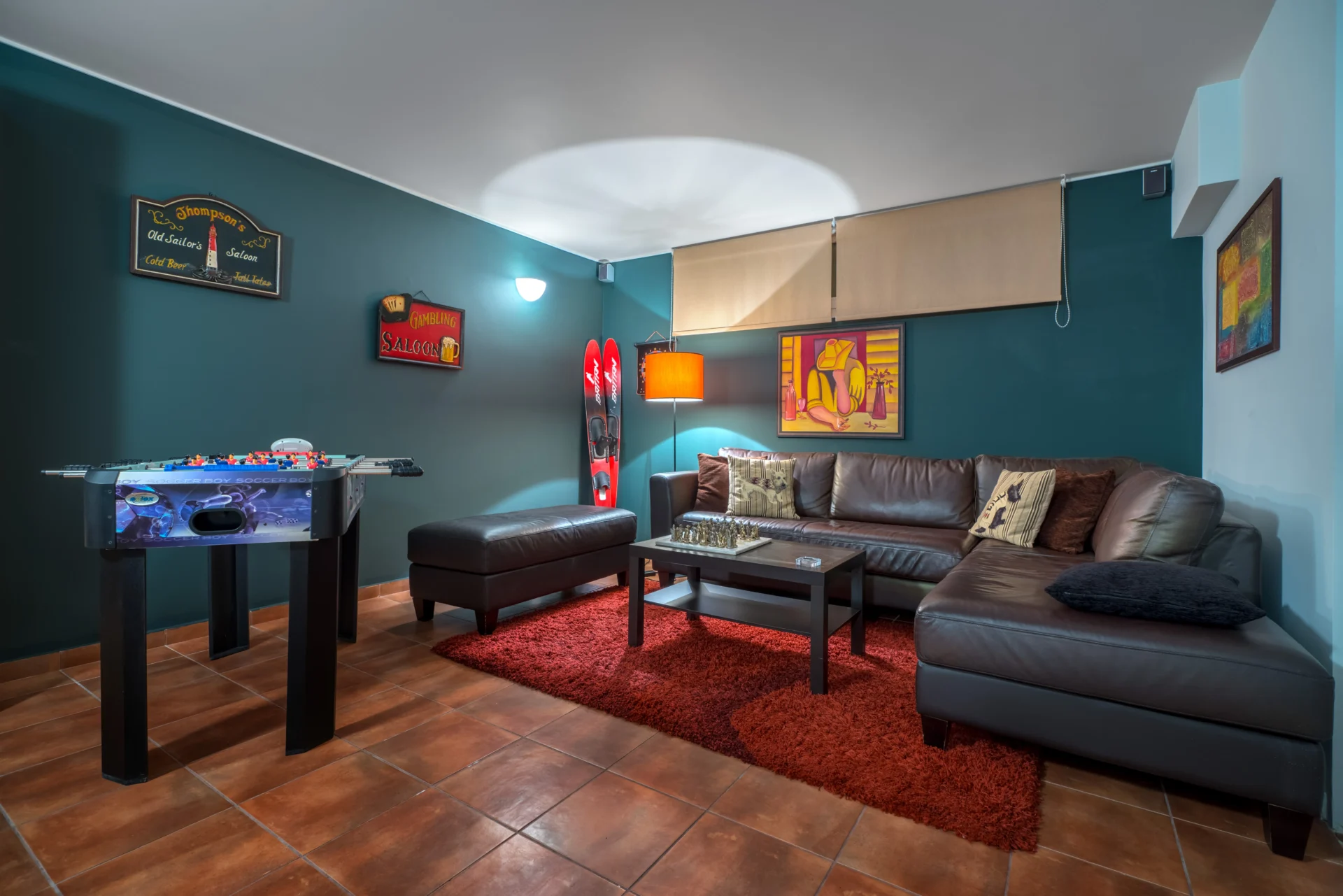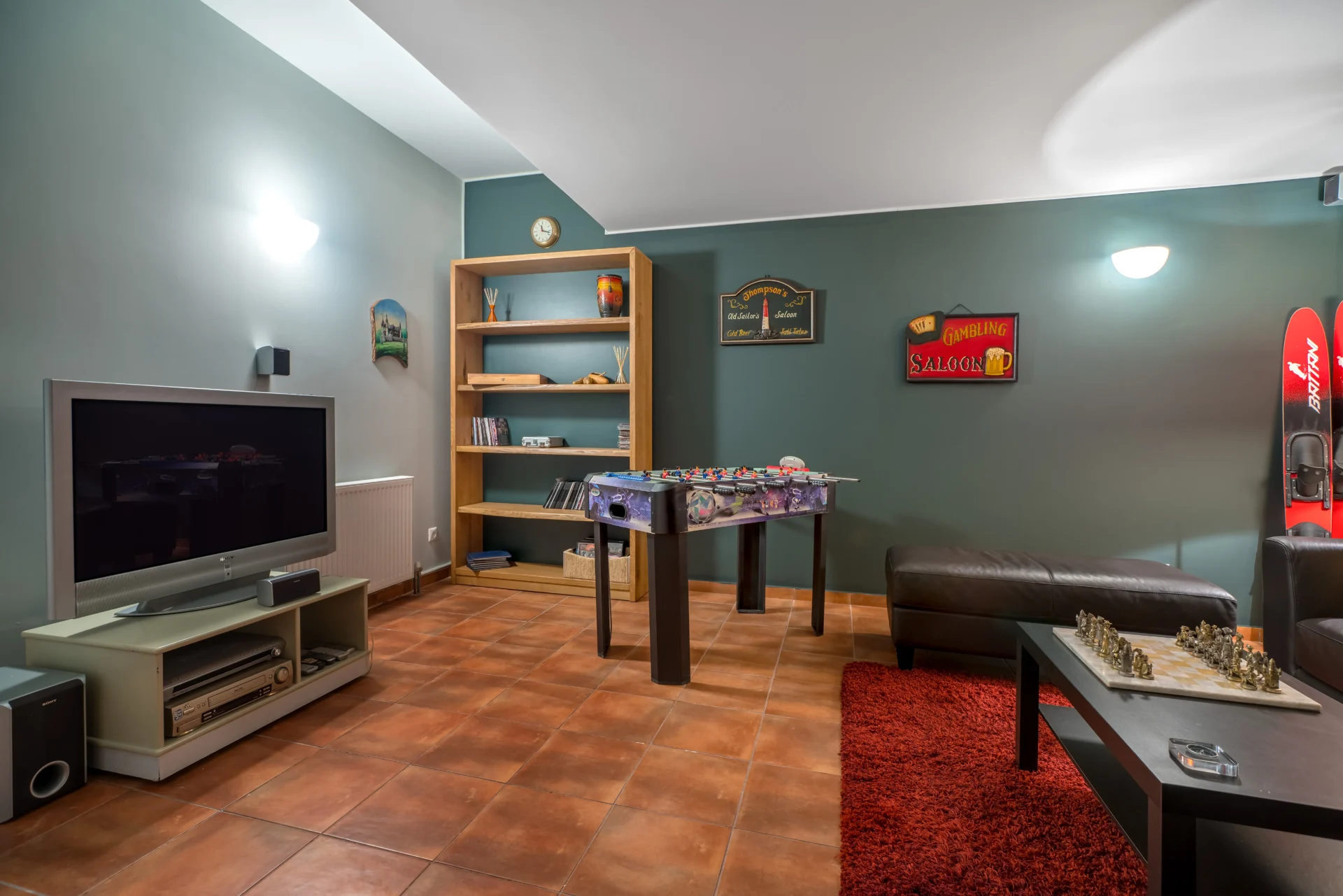 The lower floor is perfect for teenagers or guests who value extra privacy. It includes a self-contained bedroom with a kitchenette and bathroom, as well as a lounge/games room with TV and table football.