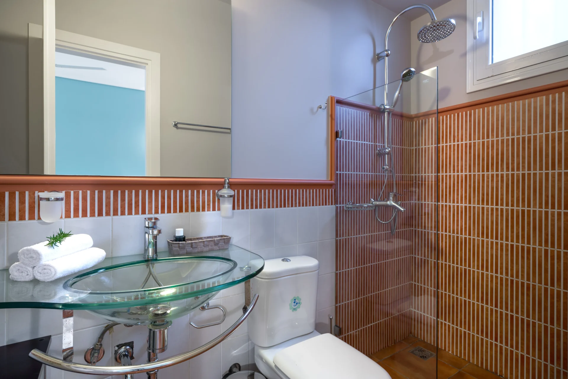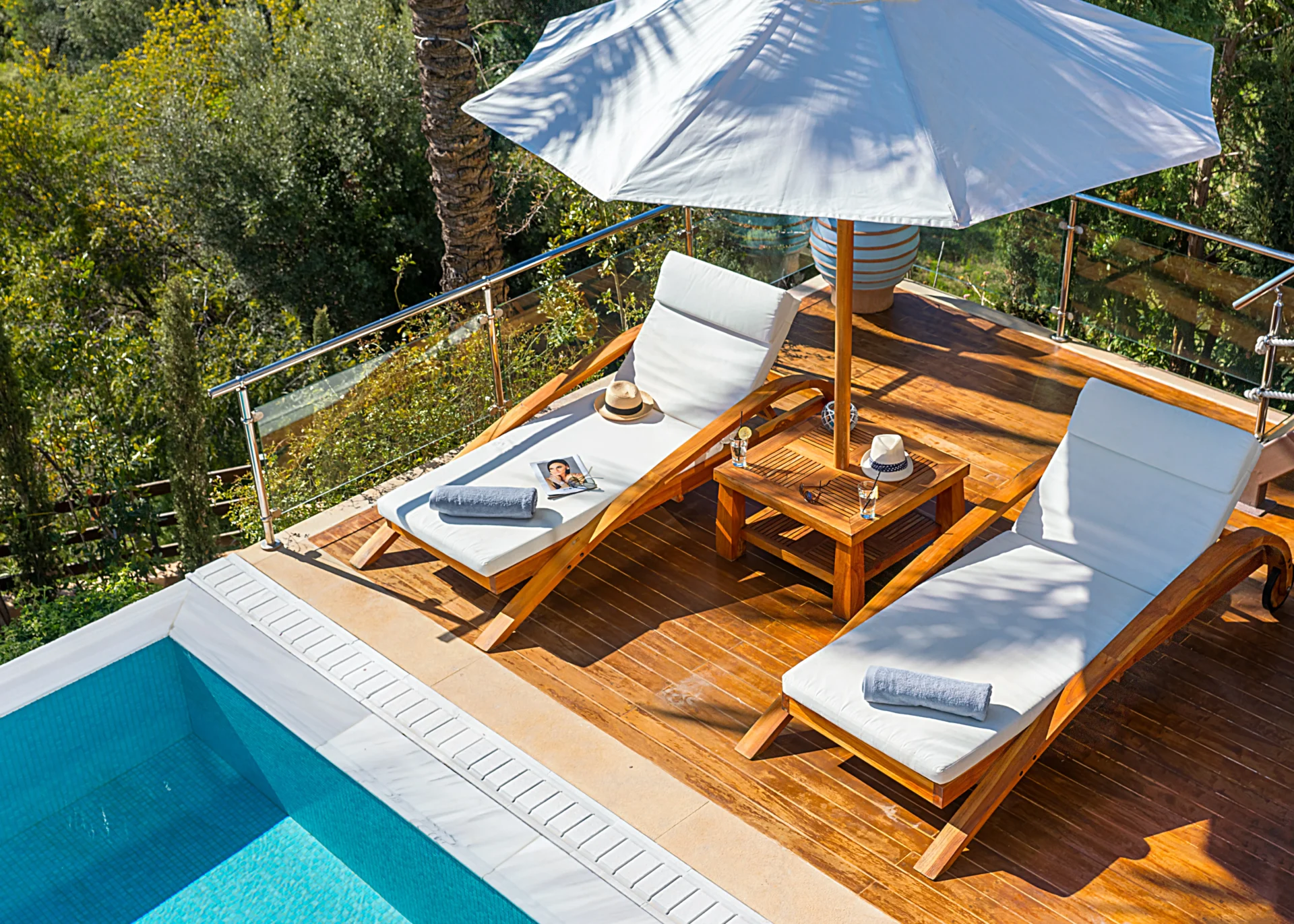 The upper floor features the master bedroom with an en-suite bathroom and balcony, plus two bright bedrooms sharing a spacious bathroom. Each room has floor-to-ceiling windows and access to a wide balcony, ideal for solitude or reading with magnificent views. An external staircase connects the upper terrace to the pool area.